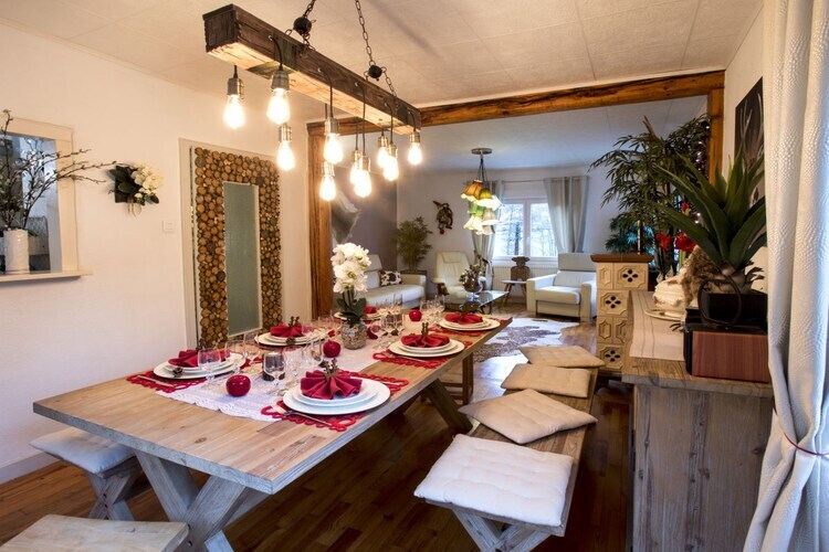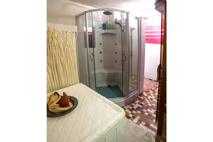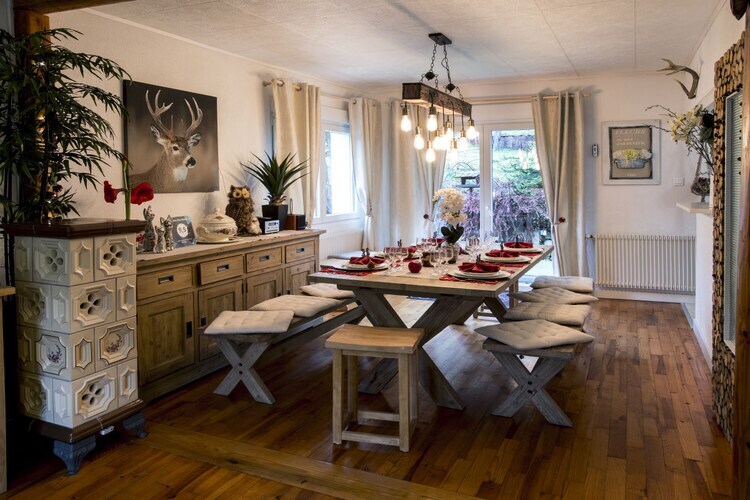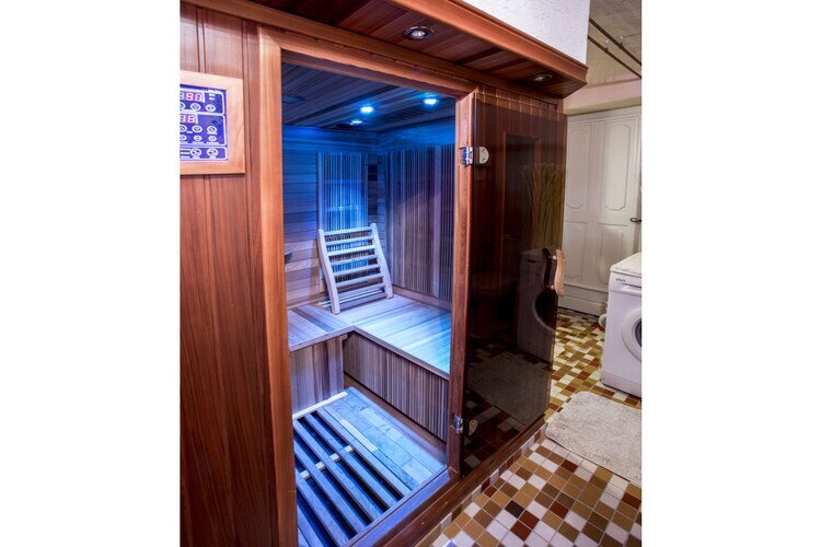 , , cuisine(poêle, grille-pain, hotte, cafetière/percolateur, four, grill, micro ondes, lave-vaisselle , réfrigérateur, ), living/chambre à coucher(TV, coin salon), chambre(lit double), chambre(lit double), chambre(lit double), salle de bains(douche, lavabo, WC), WC, garage, sèche-linge, sauna, lave-linge , chauffage, terrasse, terrasse(, mobilier de jardin, transats), jardin(Barbecue central, mobilier de jardin, transats), table à repasser, fer à repasser, séchoir
