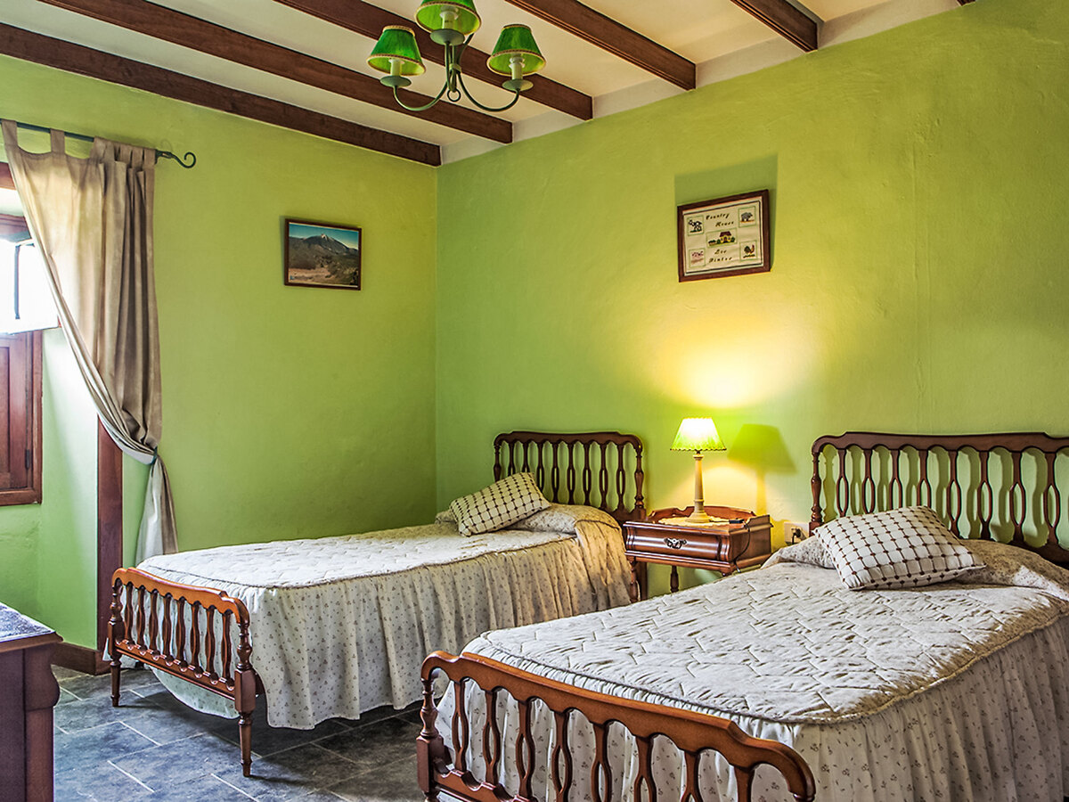 Aménagement rustique: 1 chambre avec 2 lits et radiateur électrique.