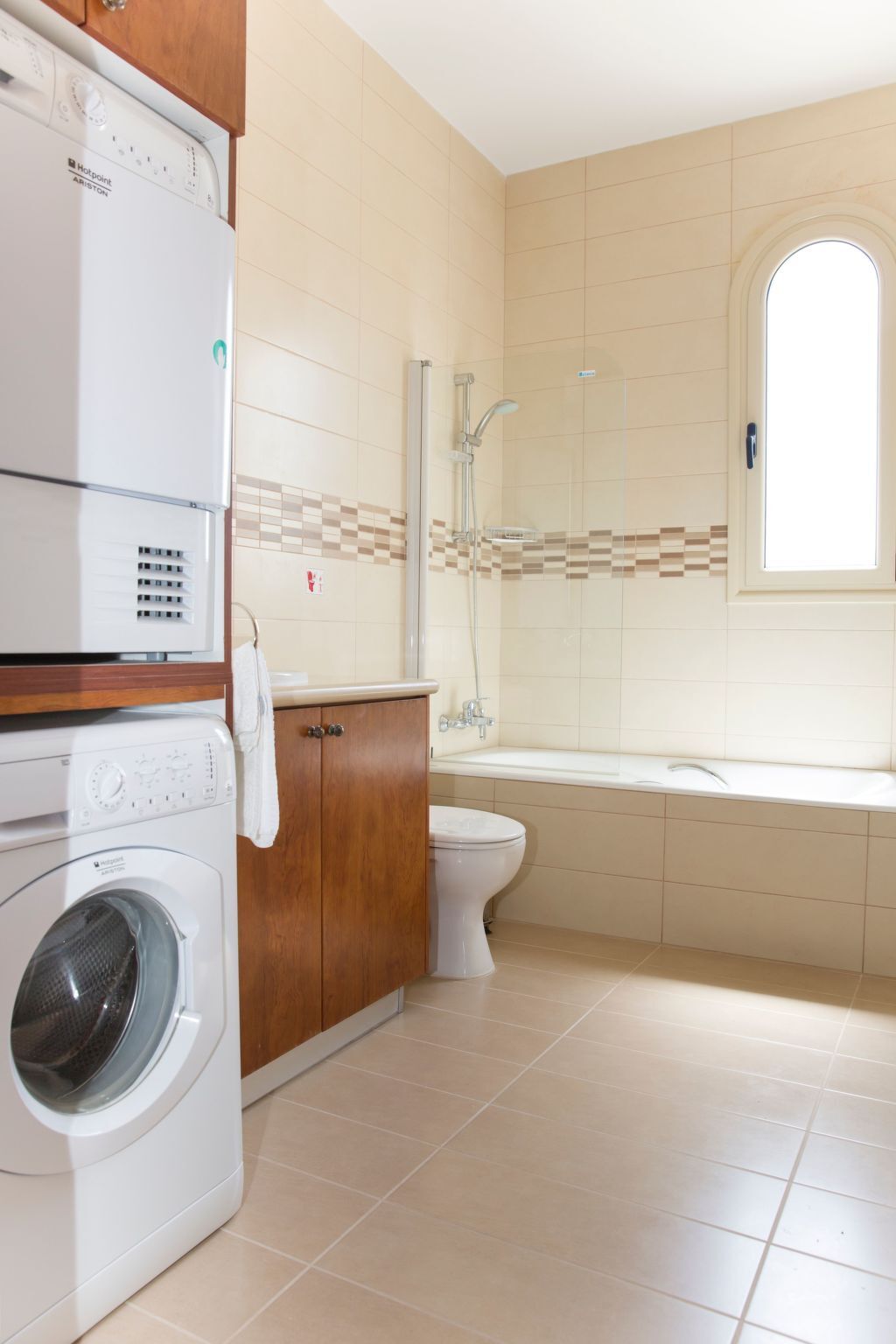 There is a utility section with washing machine and tumble dryer within the bathroom.
