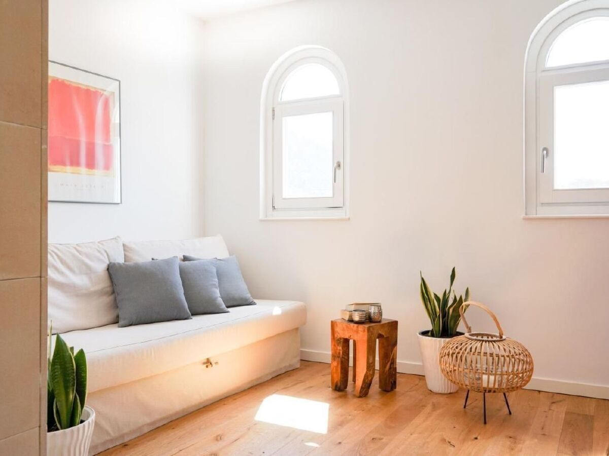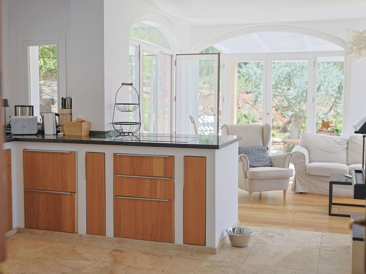 In the spacious living area with open-plan kitchen and seating for up to 8 people, glass doors lead to the terrace, where you can enjoy a delicious breakfast and the view in the morning.