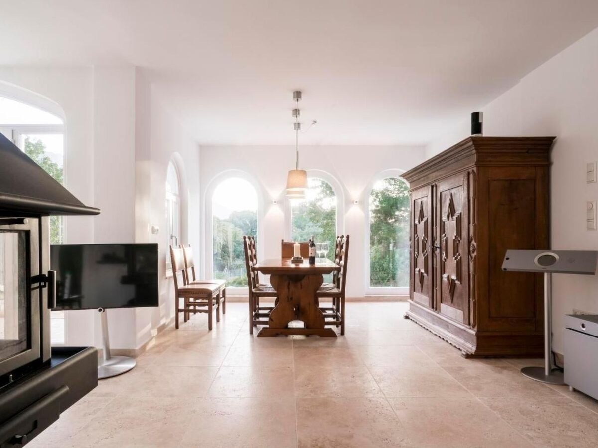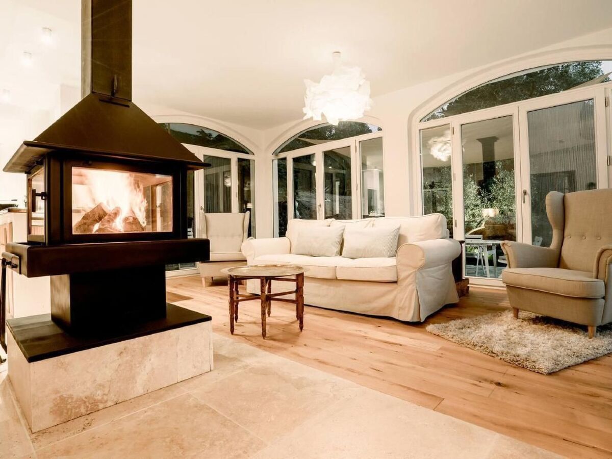 The living room with high-quality furnishings such as air conditioning, free-standing fireplace, underfloor heating, seating area, satellite TV, designer stereo system, brick-built kitchen with the latest Siemens electrical appliances, side-by-side fridge incl.