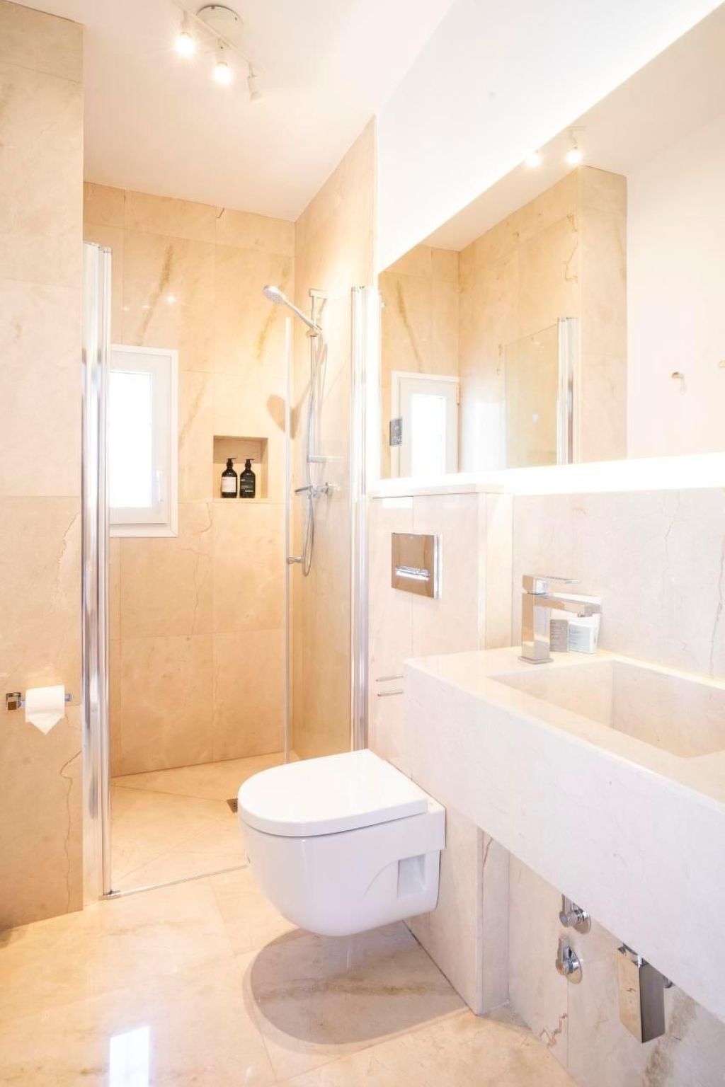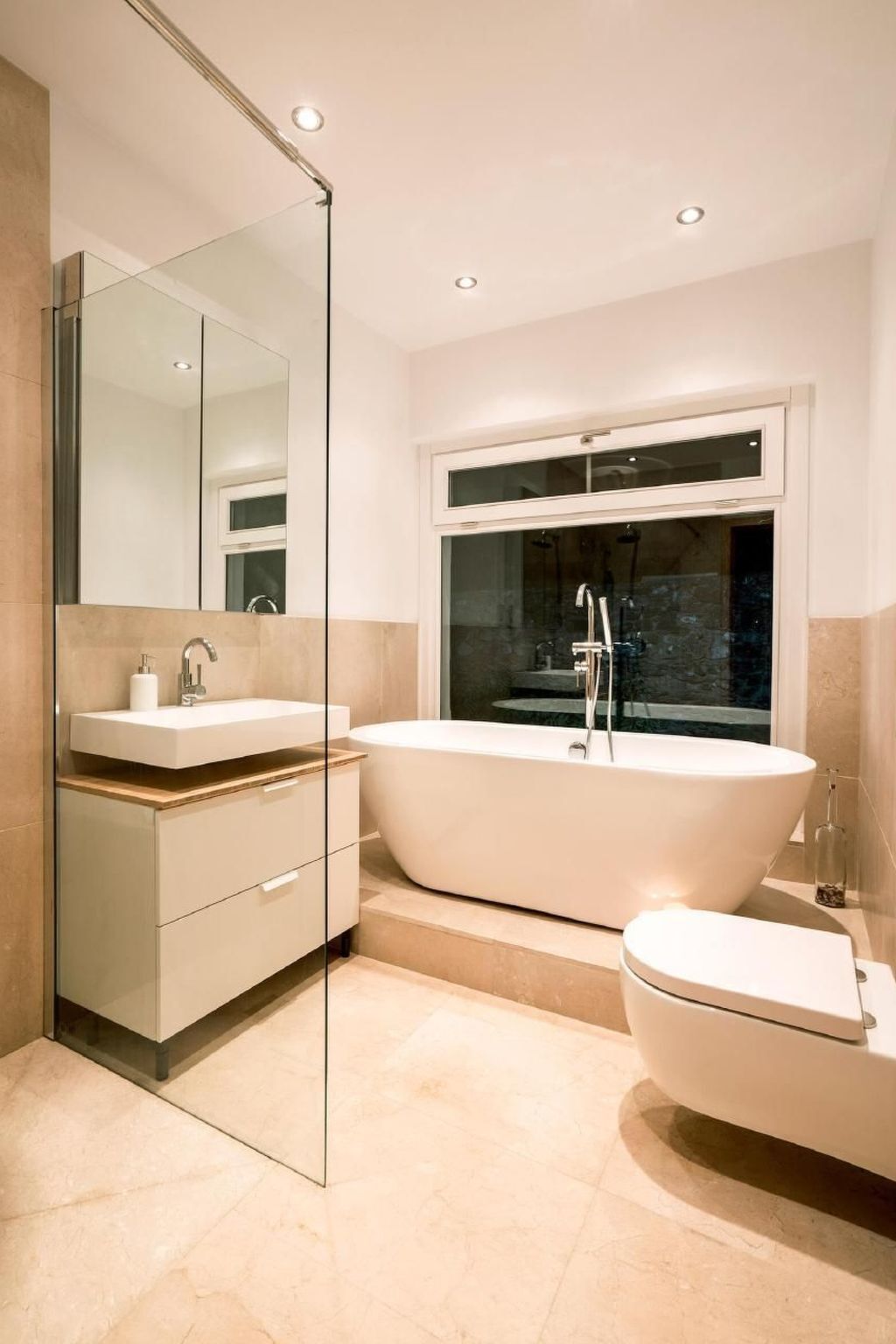 The two bedrooms on the ground floor share a bathroom with a free-standing bathtub, panoramic window and separate shower and have underfloor heating.