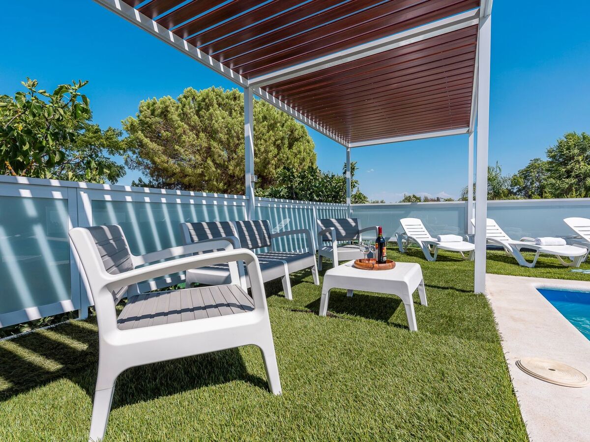Outside terrace with porch overlooking the swimming pool.
