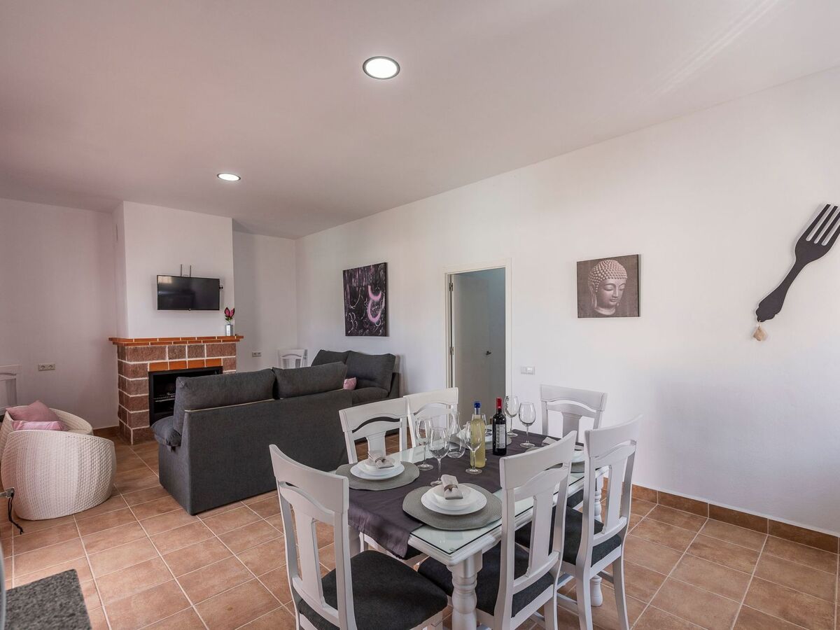 Living-dining room with fireplace and open kitchen with plasma TV with IPTV channels.