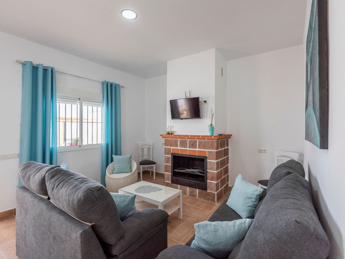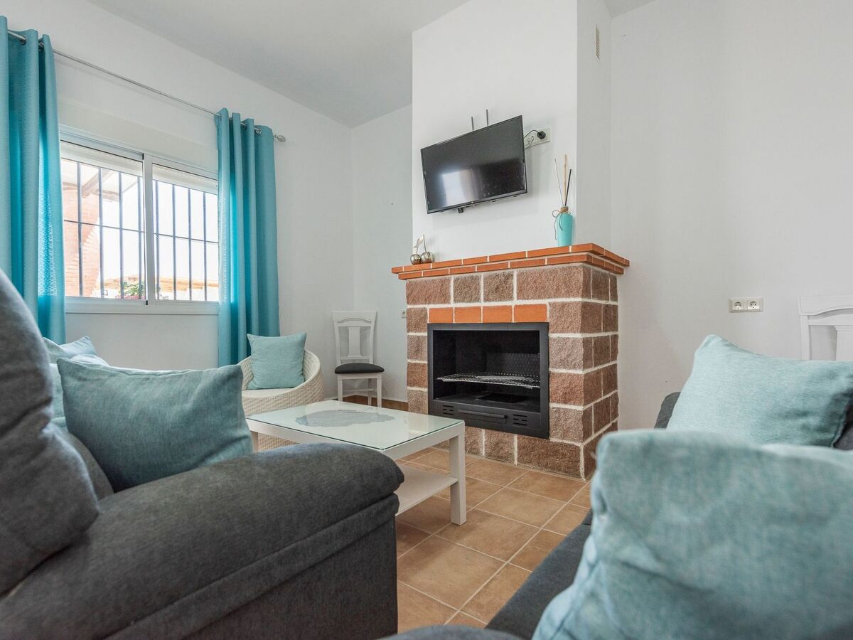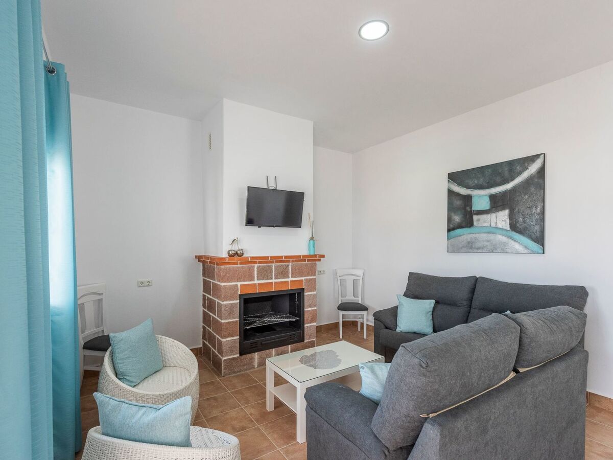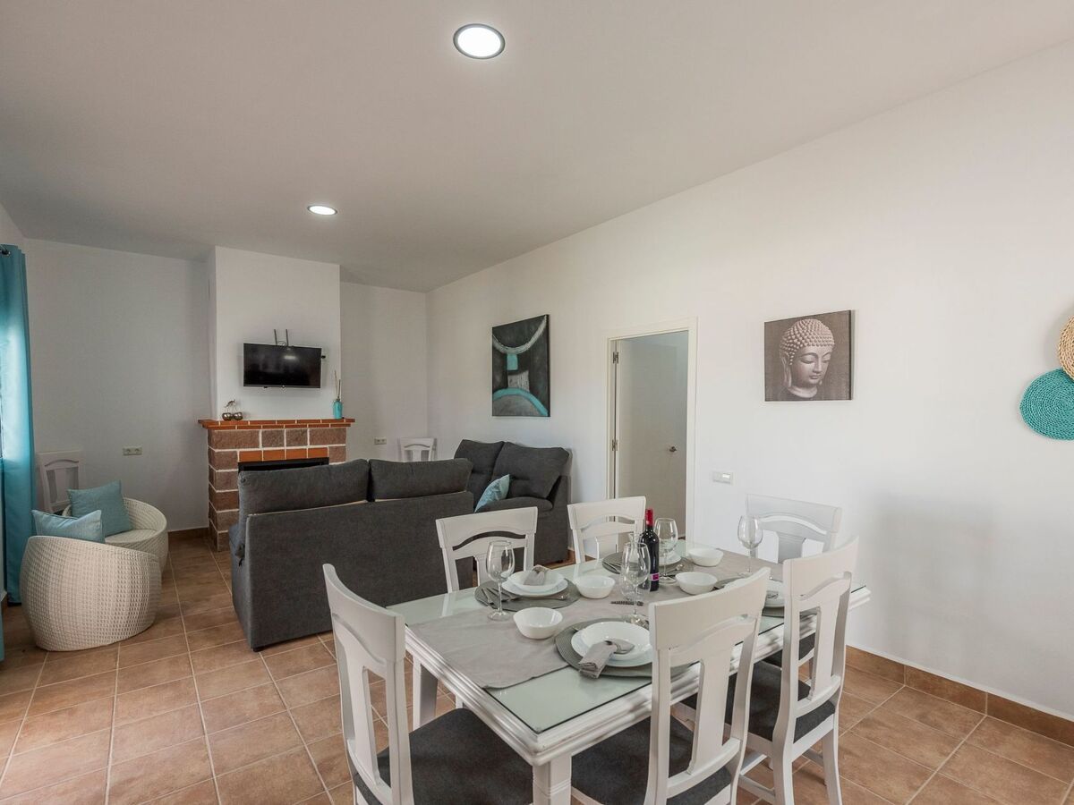 Living-dining room with fireplace and open kitchen with plasma TV with IPTV channels.