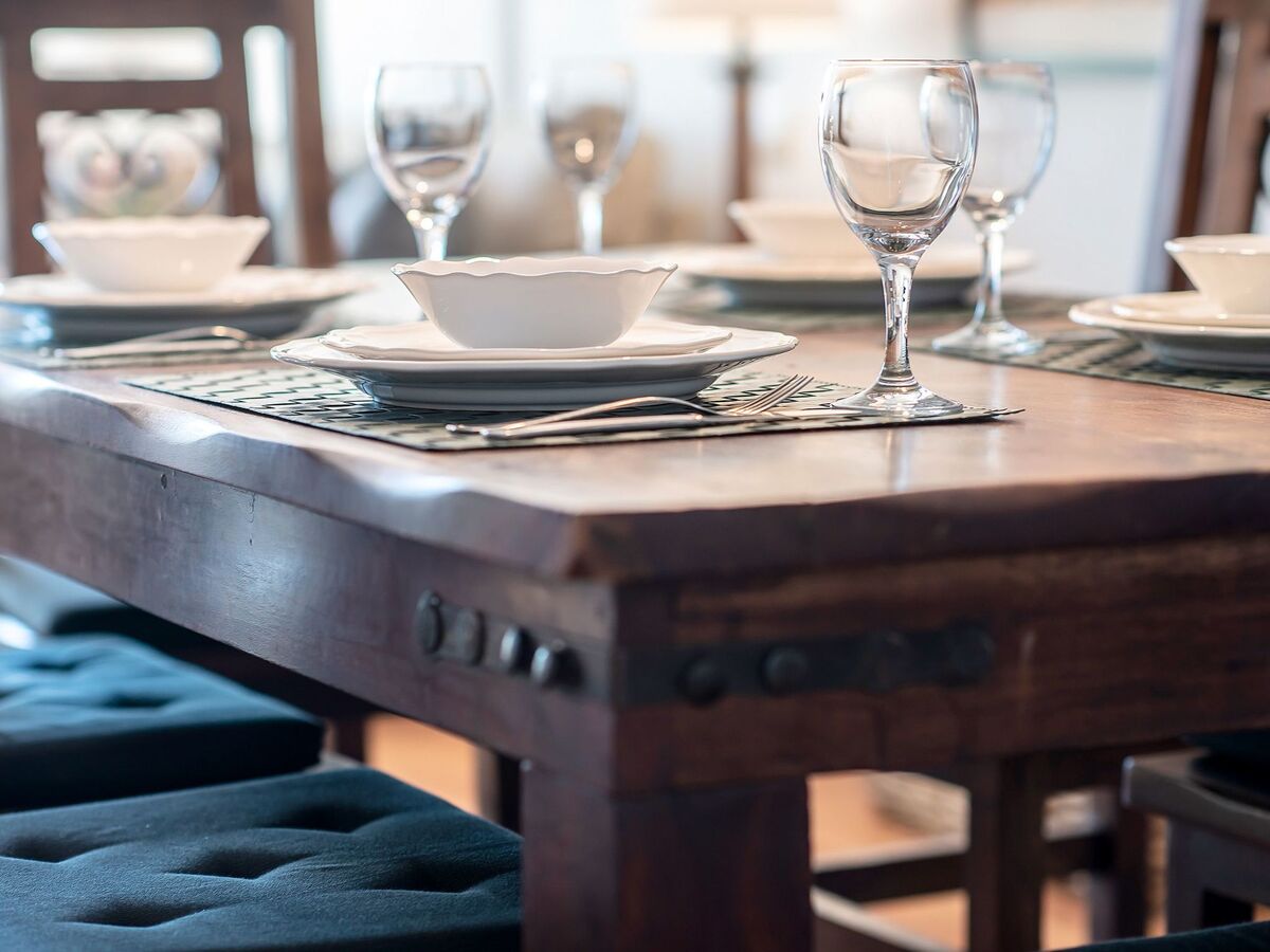 The entrance level leads down to the open-plan and extensively equipped kitchen, dining and living area.