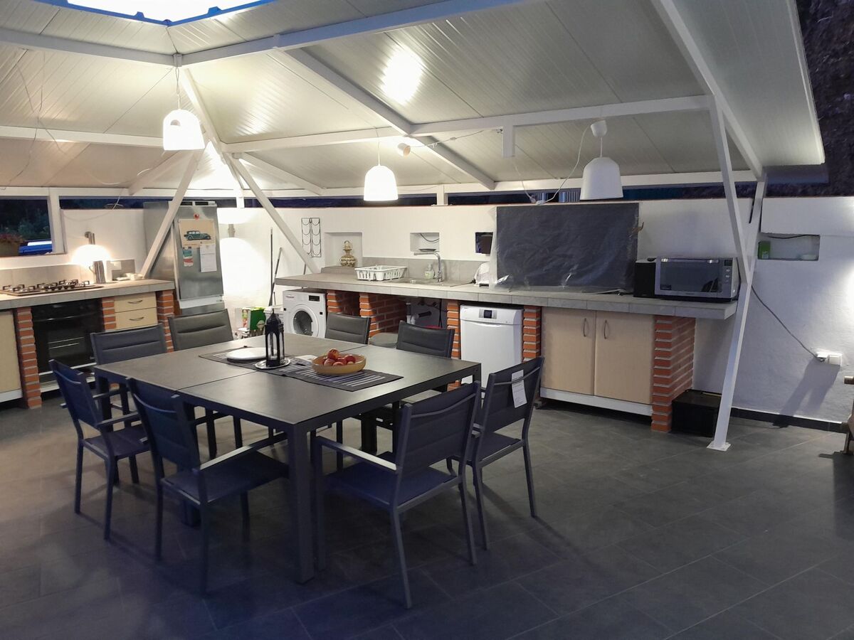 The large eat-in kitchen with a view of the sea has a roof that is open to the garden, so it can be used both "outside" and "inside".