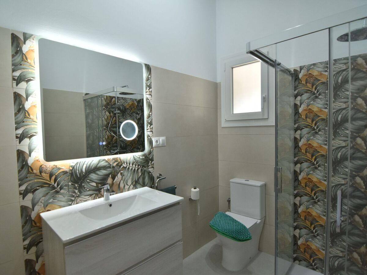 A spacious new bathroom with a smart mirror and rain shower offers a rejuvenating experience.