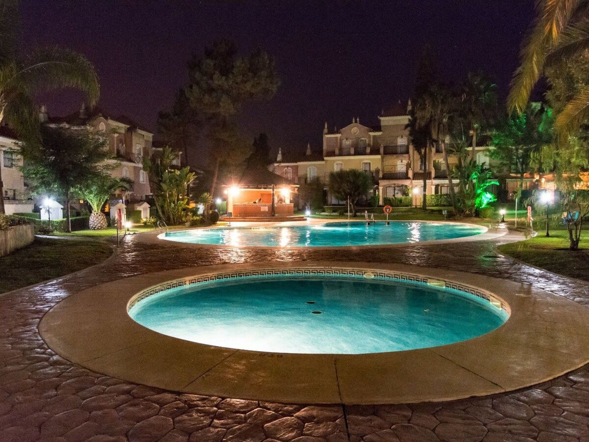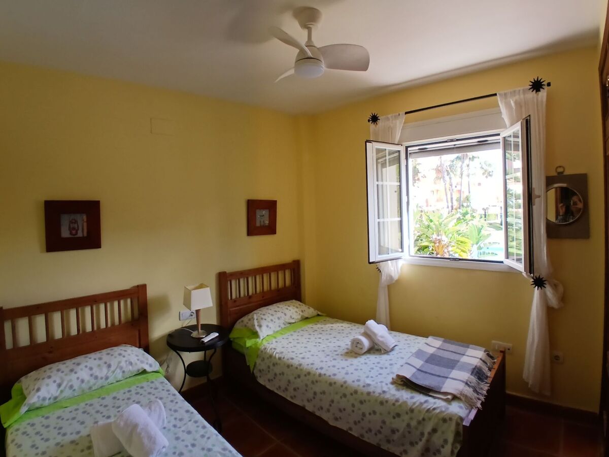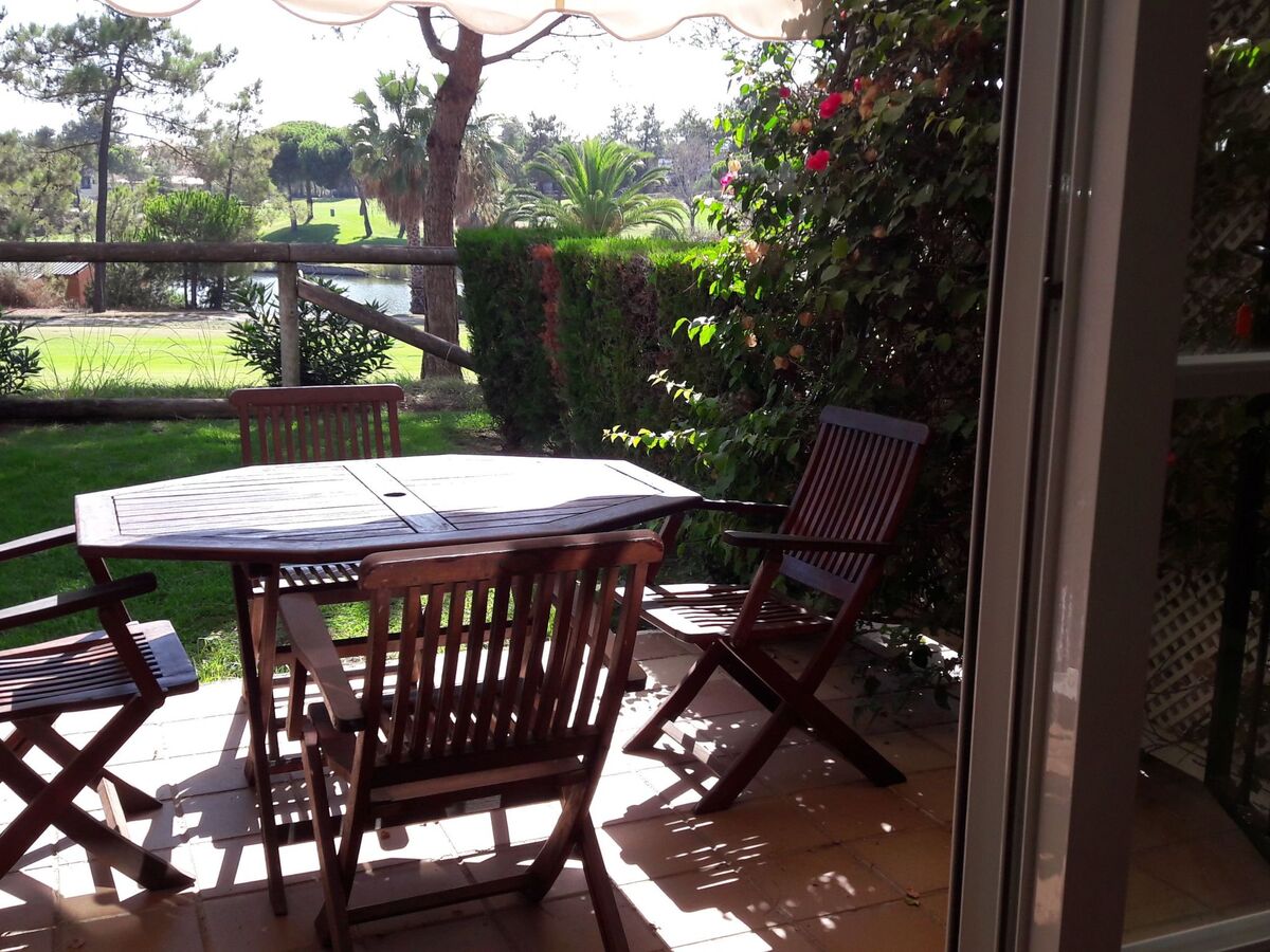 One bedroom has a double bed overlooking the lake in hole 1 and the other has two single beds overlooking the gardens and pools.