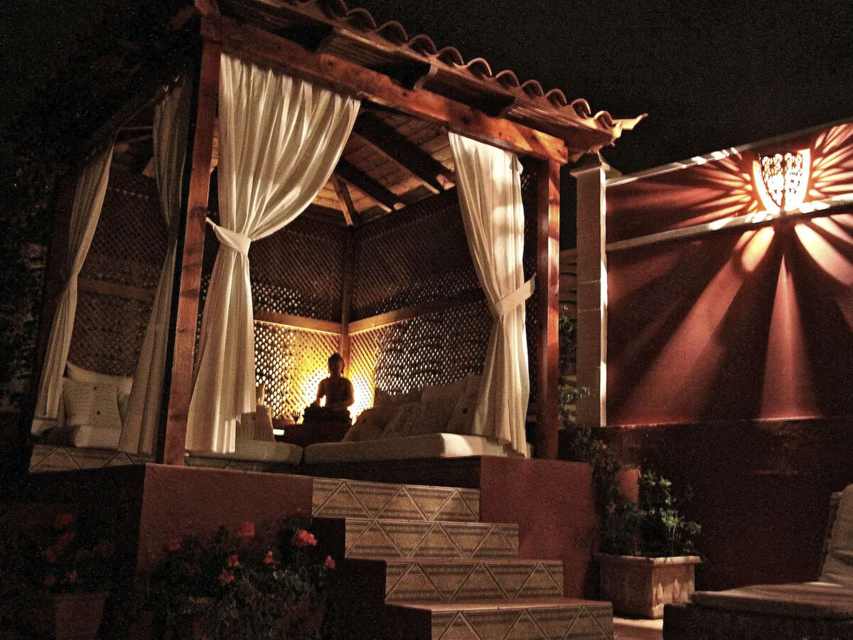 Surrounded by hedges and presided over by a stone statue is the Balinese bed.