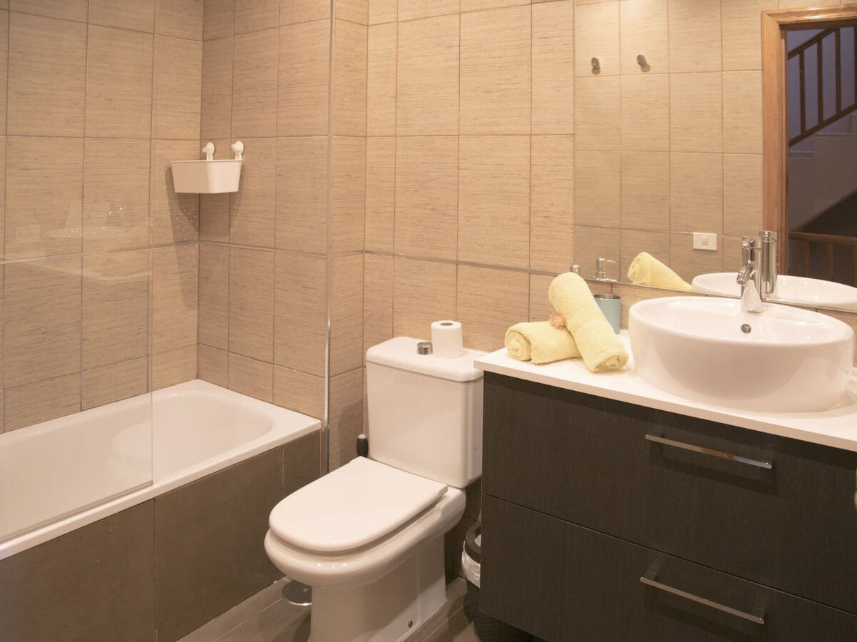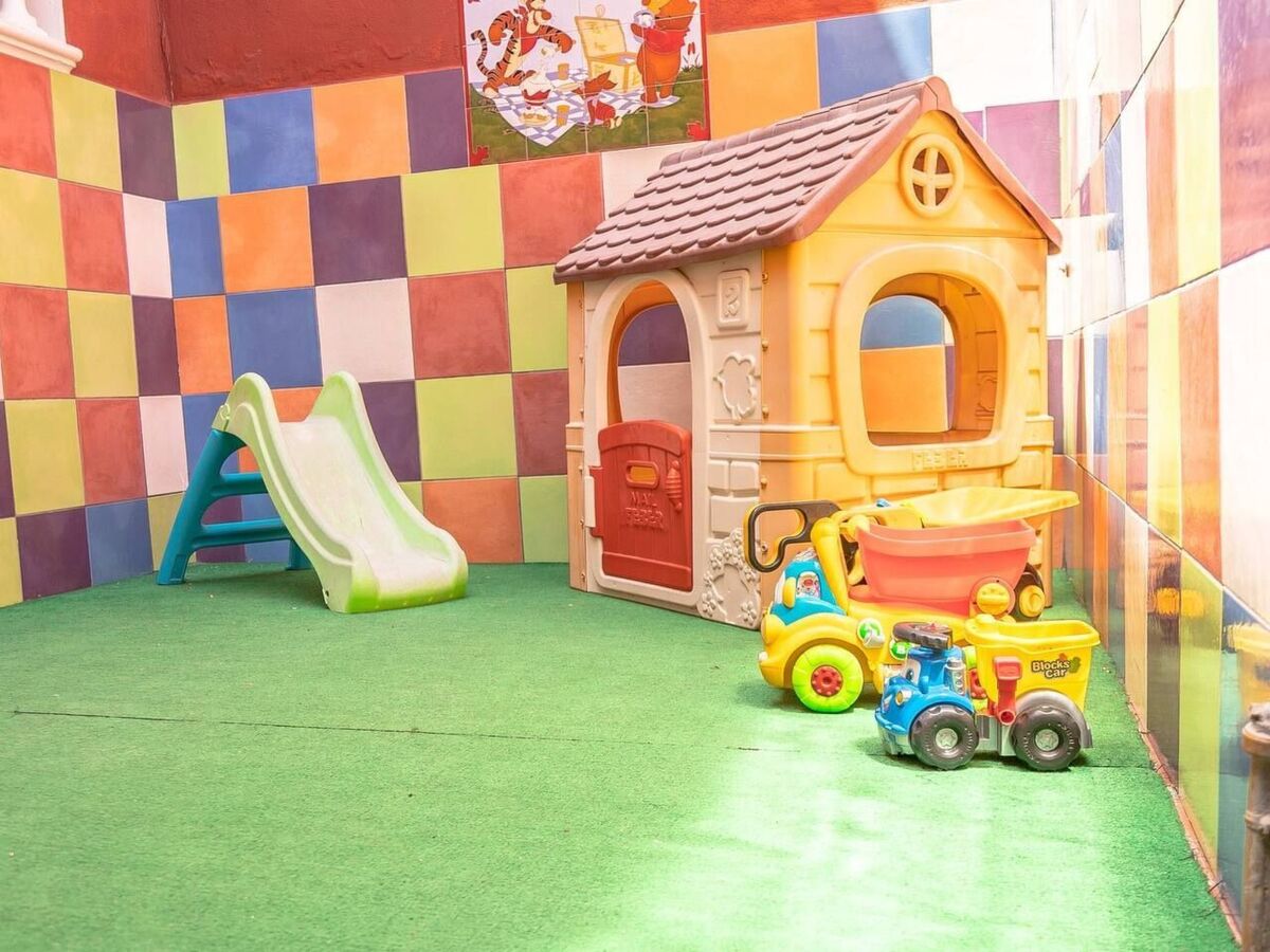 On the ground floor there is a spacious living room, a fully equipped kitchen, a toilet, a children's play area with direct view from the kitchen, and going downstairs, the games room with billiards and table football.