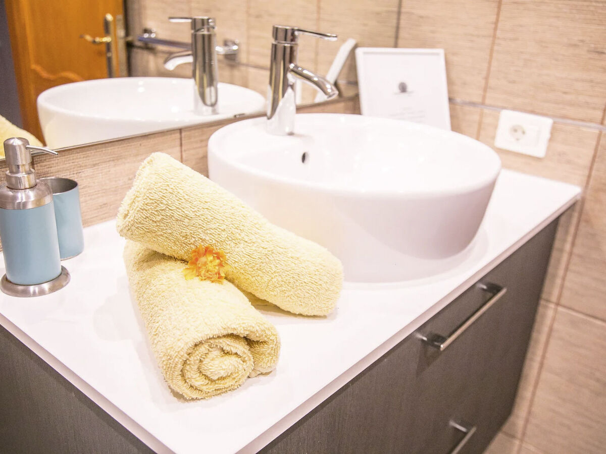The first bedroom with balcony has a double bed and en suite bathroom with shower.