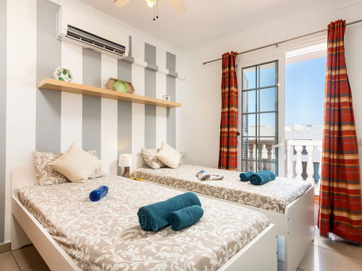 Un escalier mène à l'étage supérieur avec deux chambres à coucher (chacune avec des lits simples) qui partagent une salle de bain, ainsi que la chambre à coucher principale avec télévision par satellite, salle de bain privée et accès à une terrasse privée avec vue sur la mer.