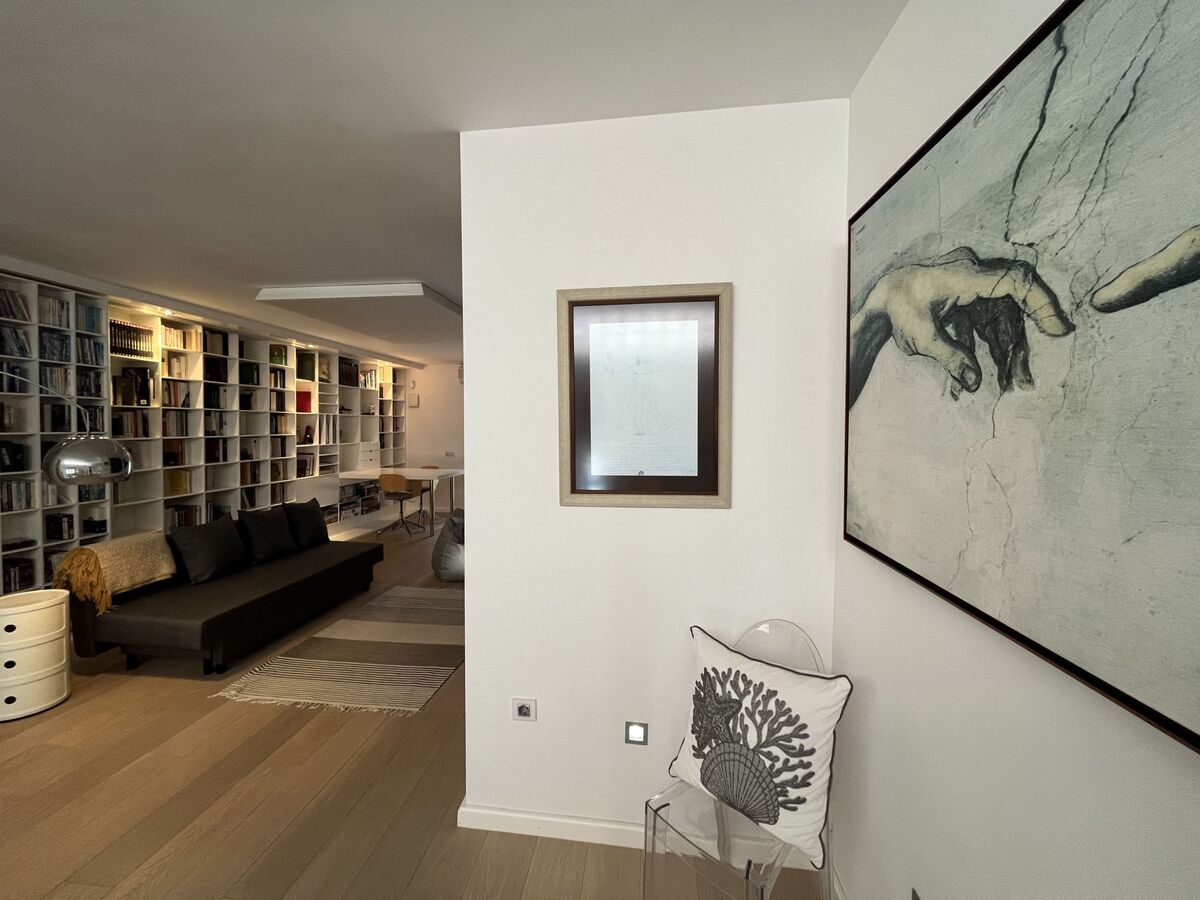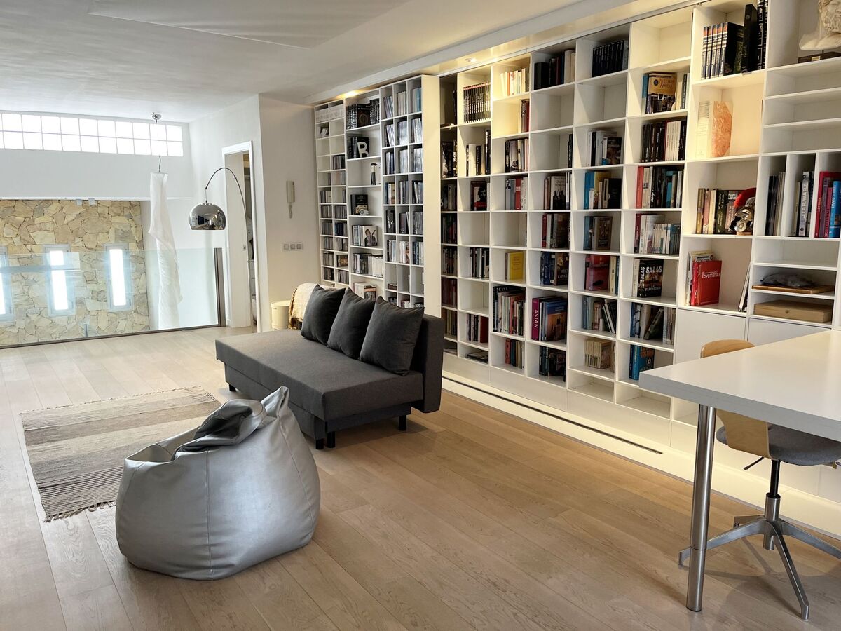 On the way upstairs there is a work area with views of both the ground floor and the upper floor, where there is a large library with another study area, and a double bedroom with private bathroom.