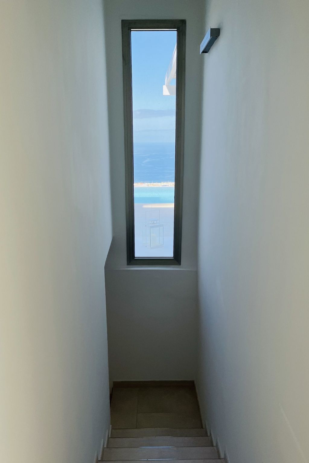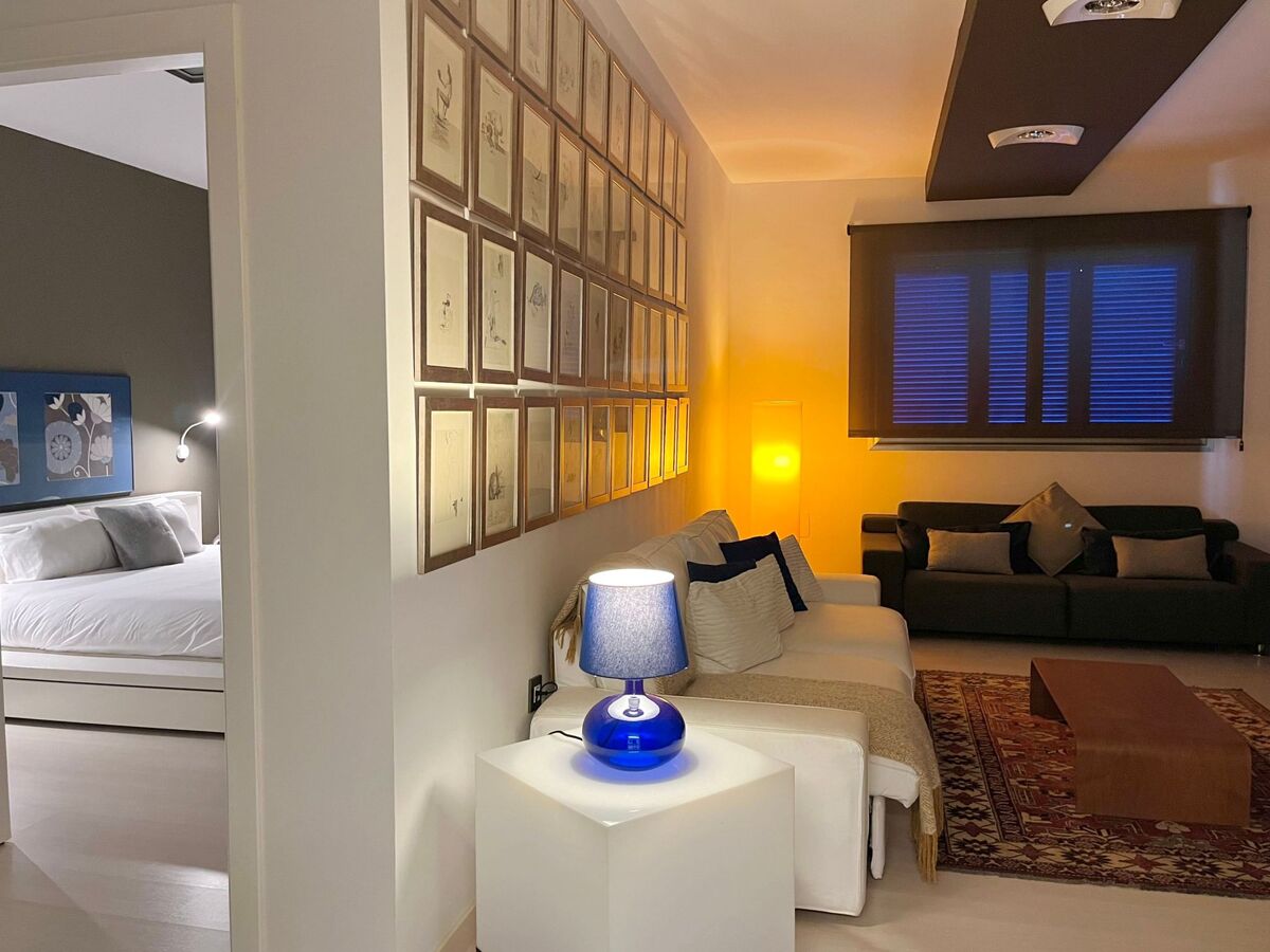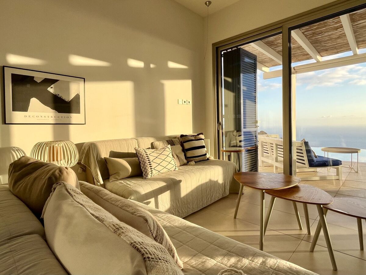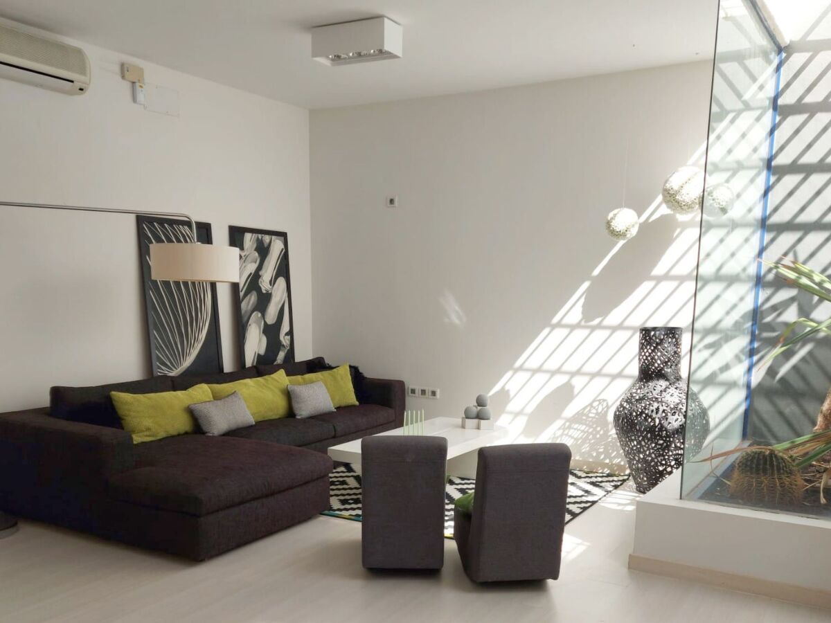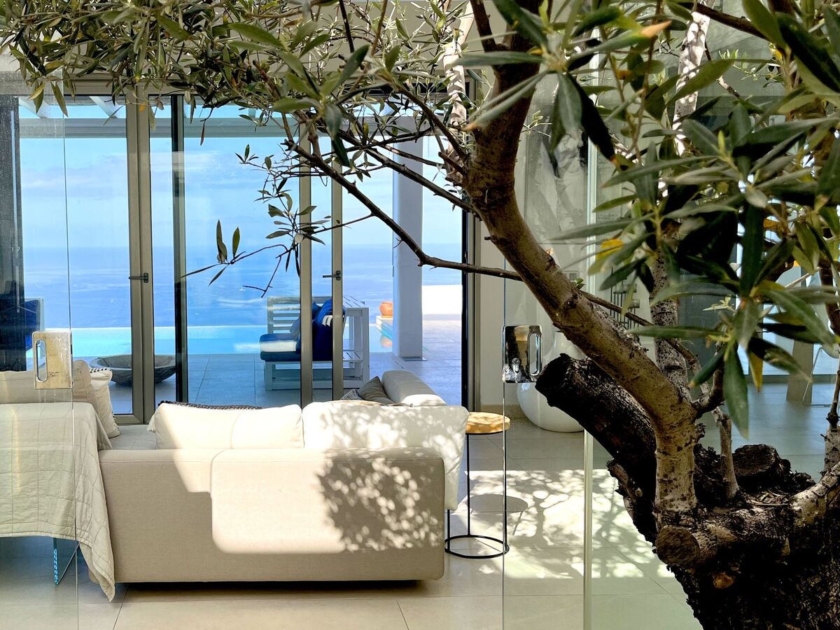 In the interior area we find a living room with sofas in front of a large window with sea view and an olive tree that presides over the space within an inner courtyard.
