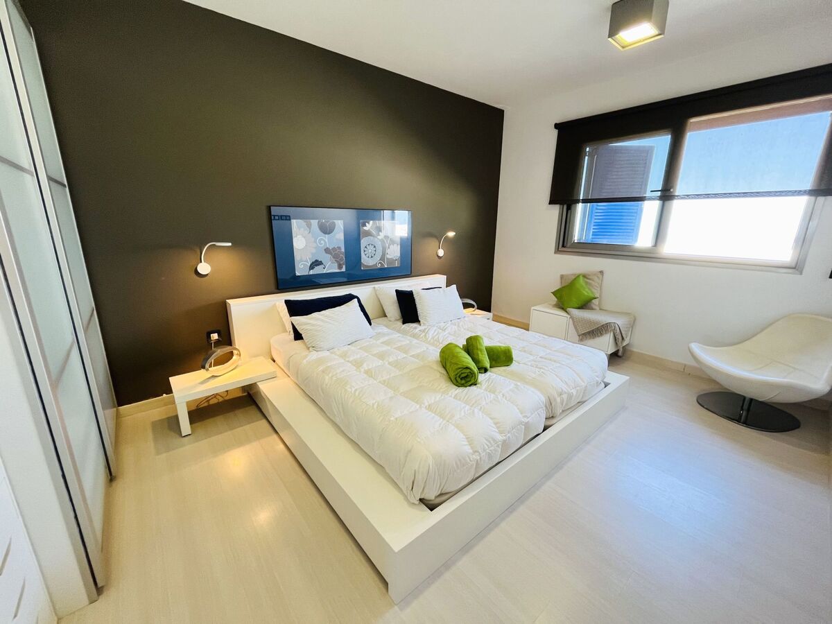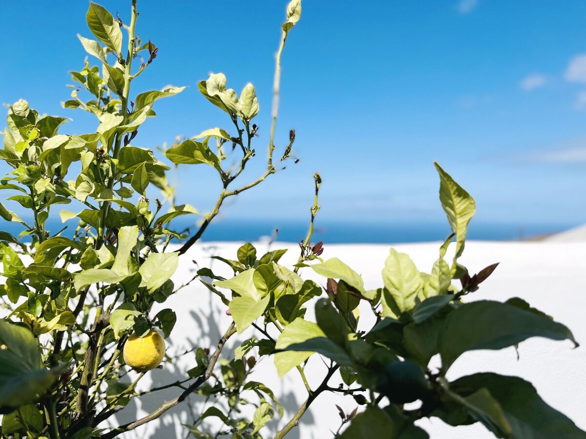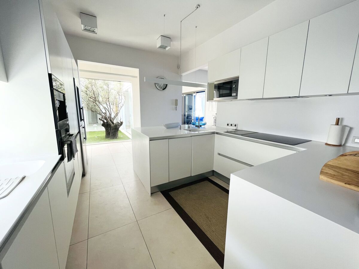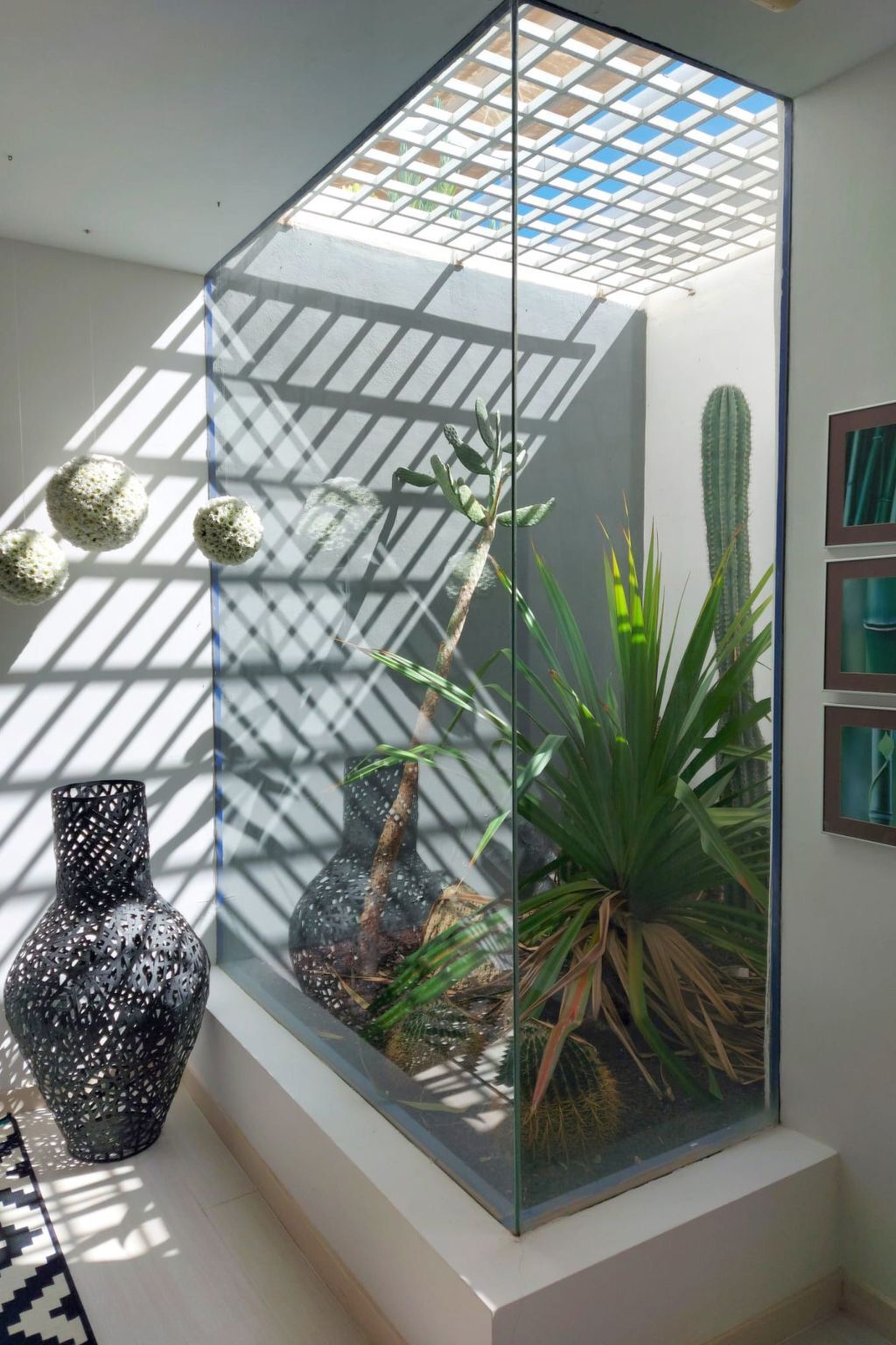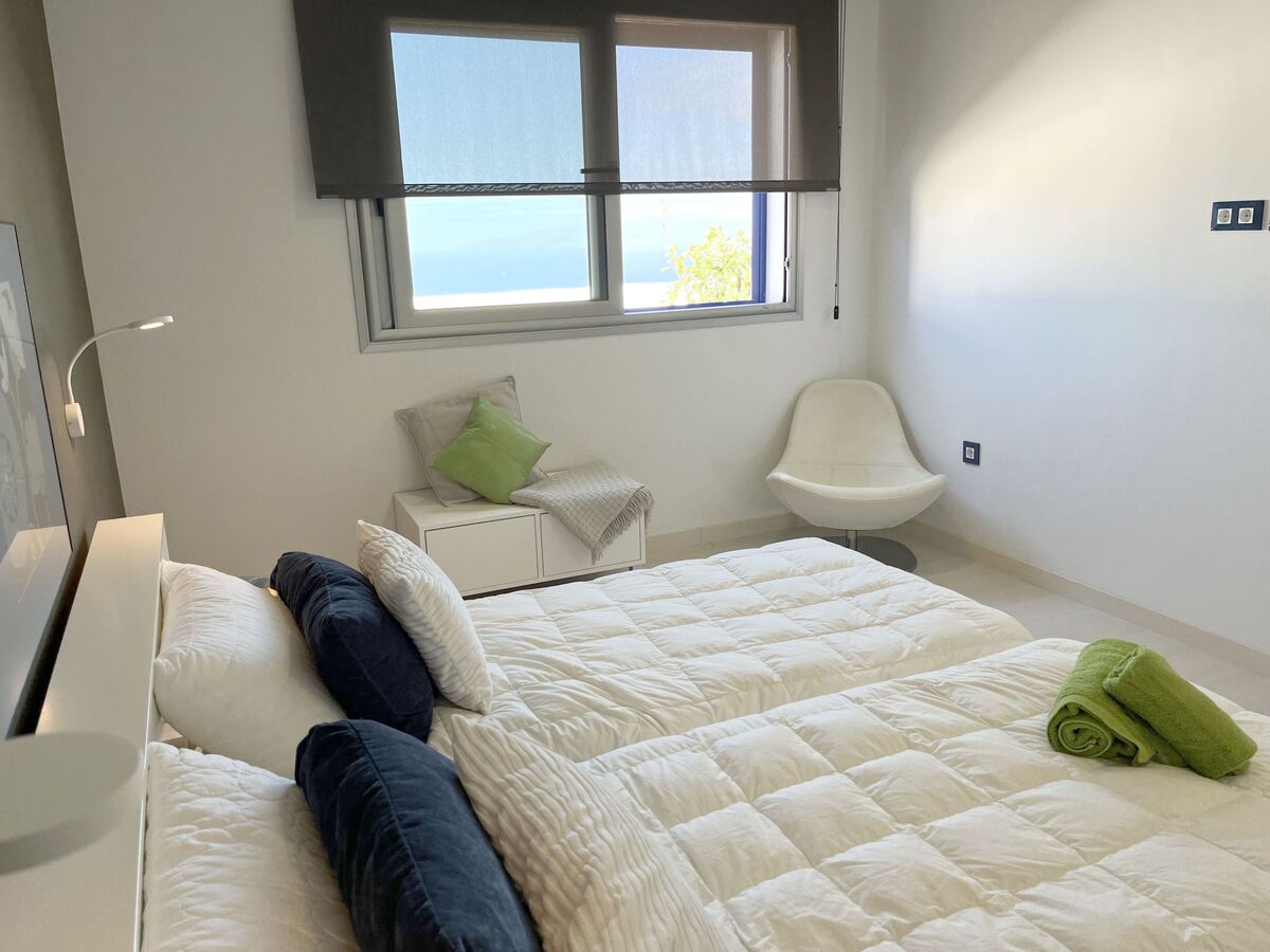 In the interior area we find a living room with sofas in front of a large window with sea view and an olive tree that presides over the space within an inner courtyard.