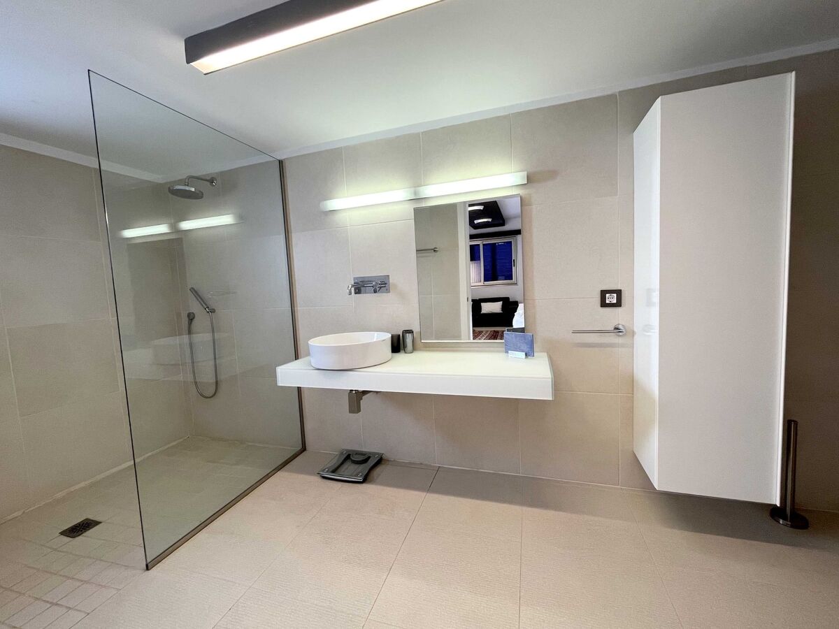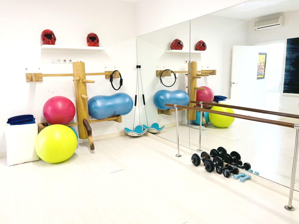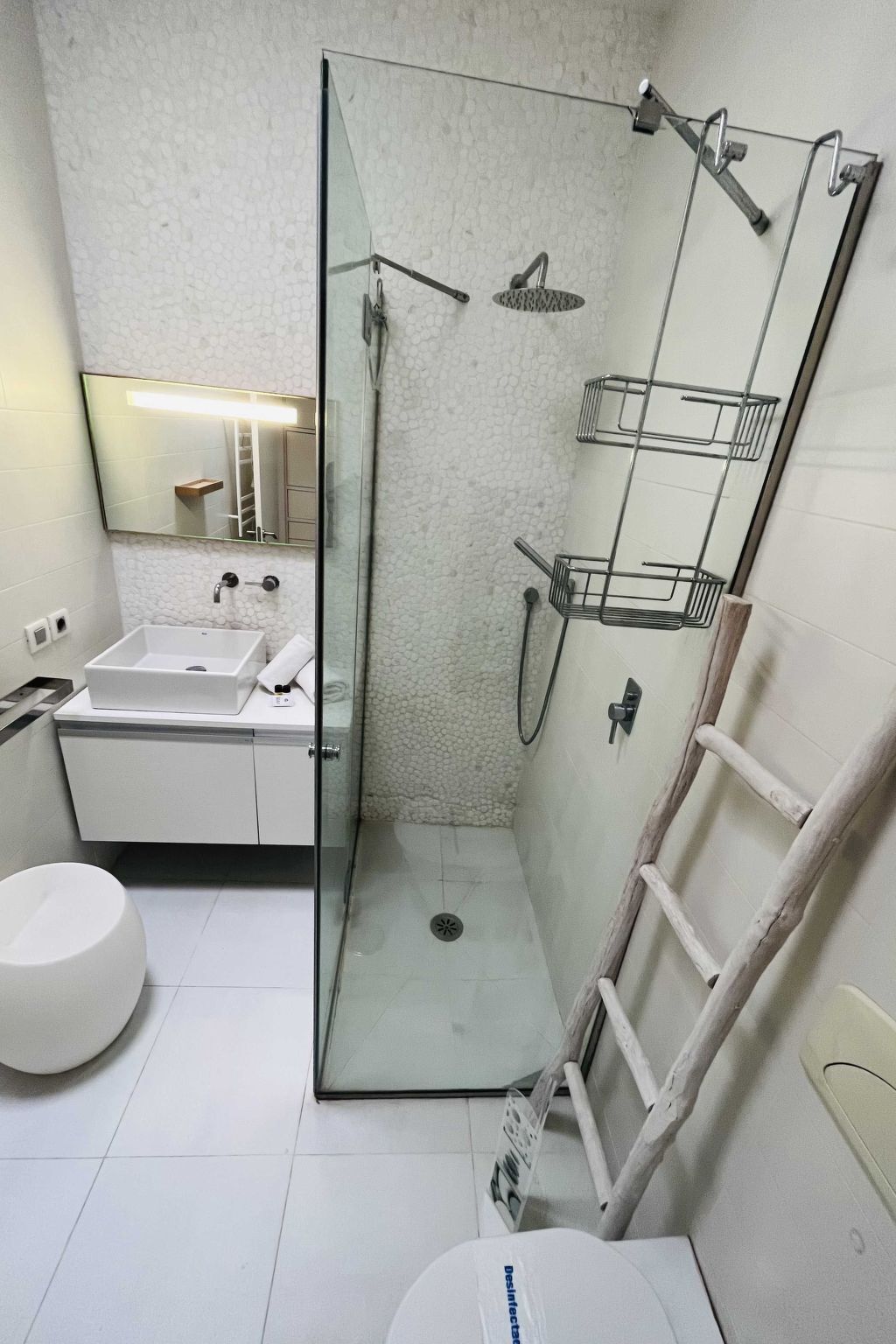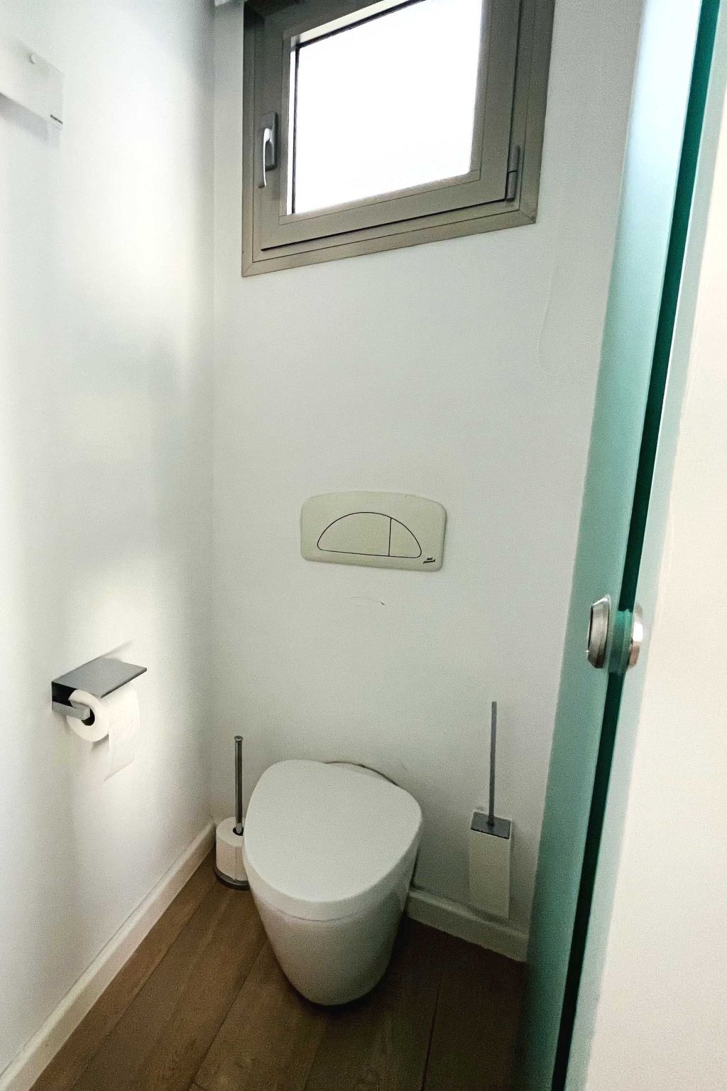 On floor -1, we find a large living room with board games, gym, a bathroom with shower and an independent flat with private living room, double bedroom, bathroom with shower and access to a patio with hammocks.