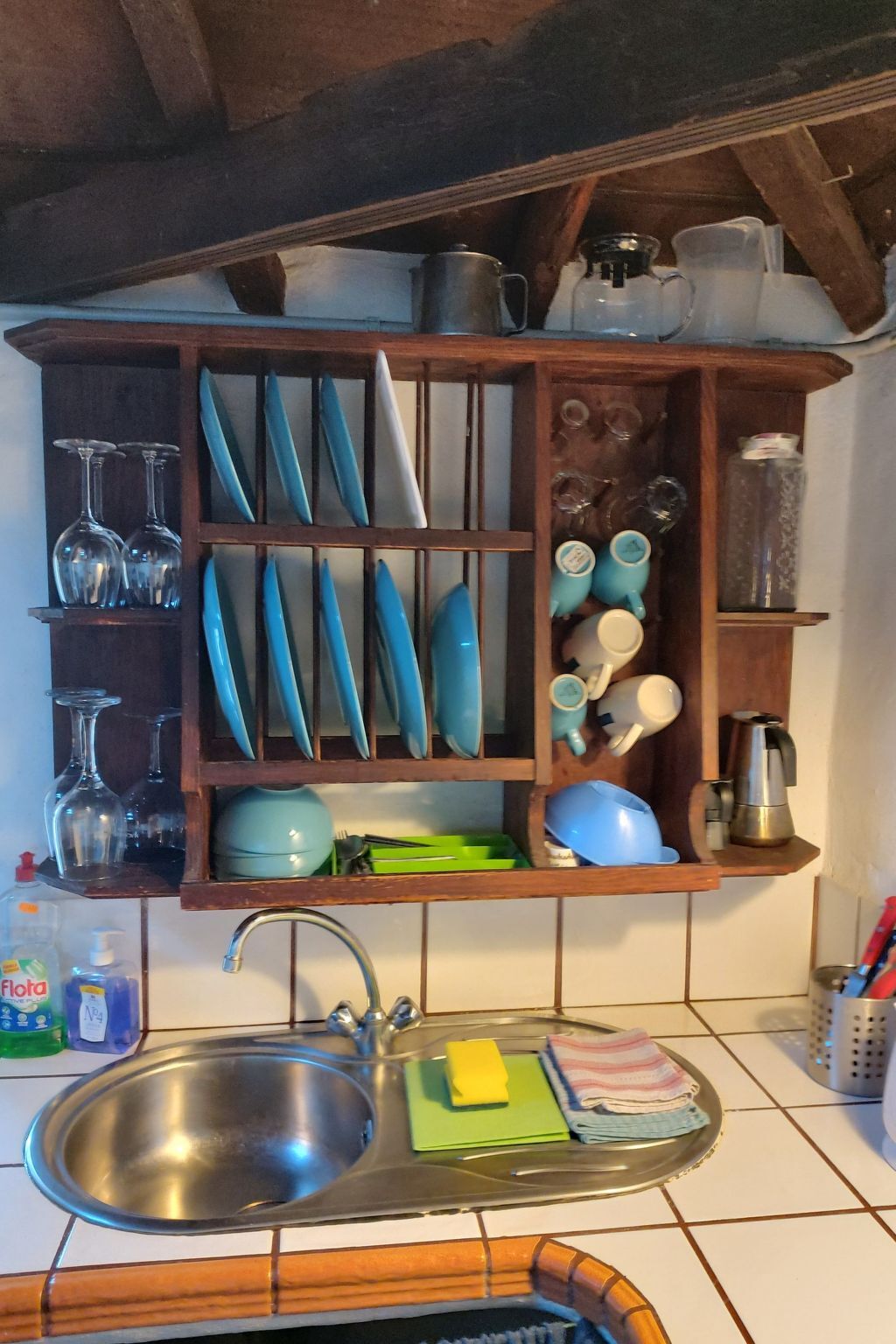 The kitchen is equipped with an oven, gas hob, fridge and other useful kitchen utensils such as a coffee machine for preparing delicious meals.