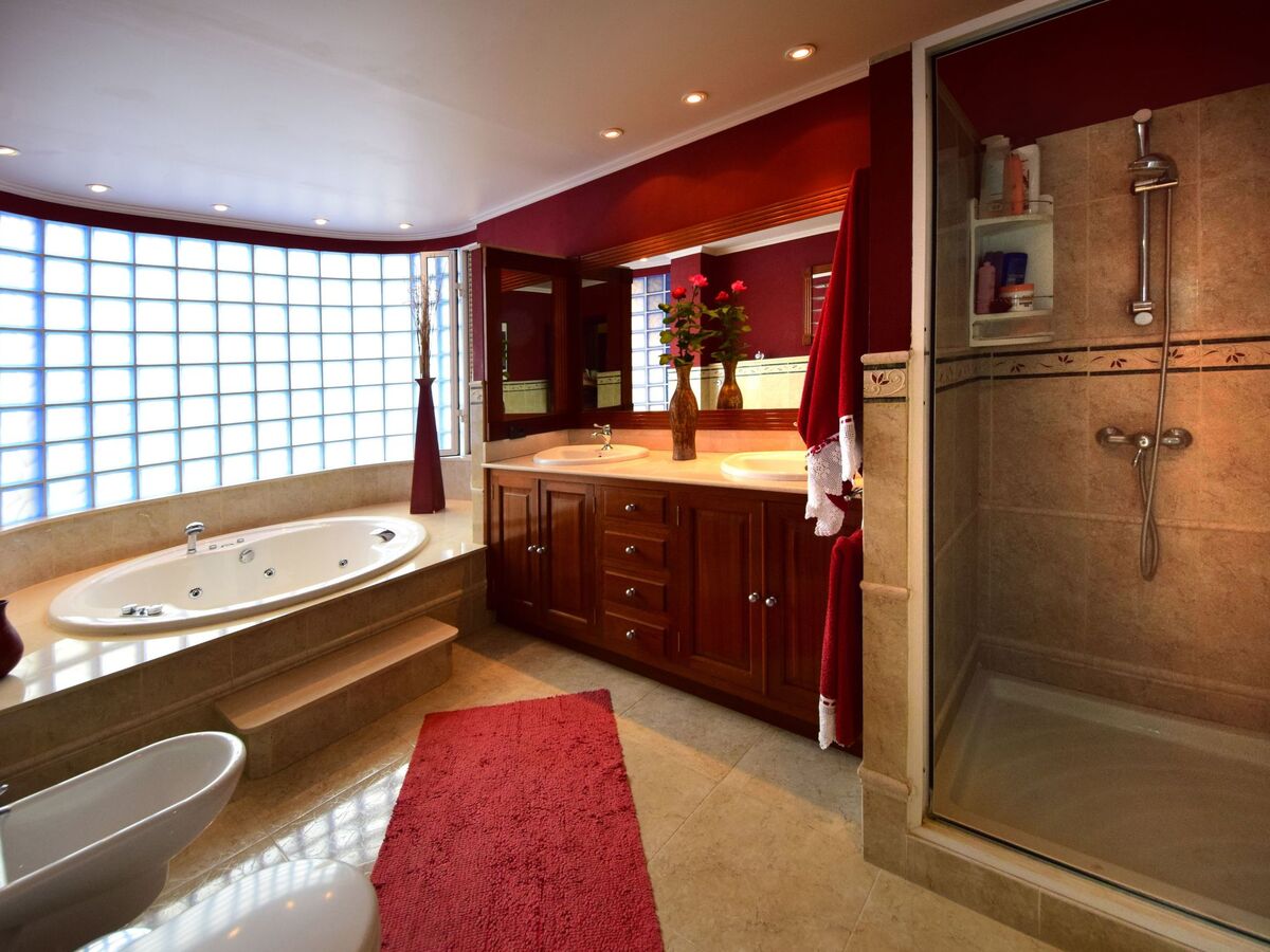 Further on, there is a room with a double bed and the master bedroom with a double bed and a private bathroom with a shower and bathtub.