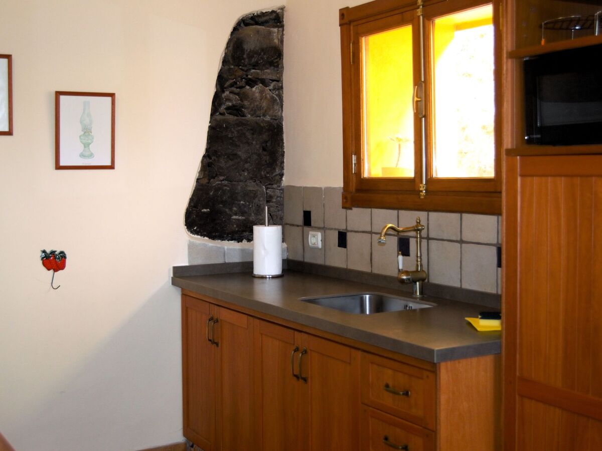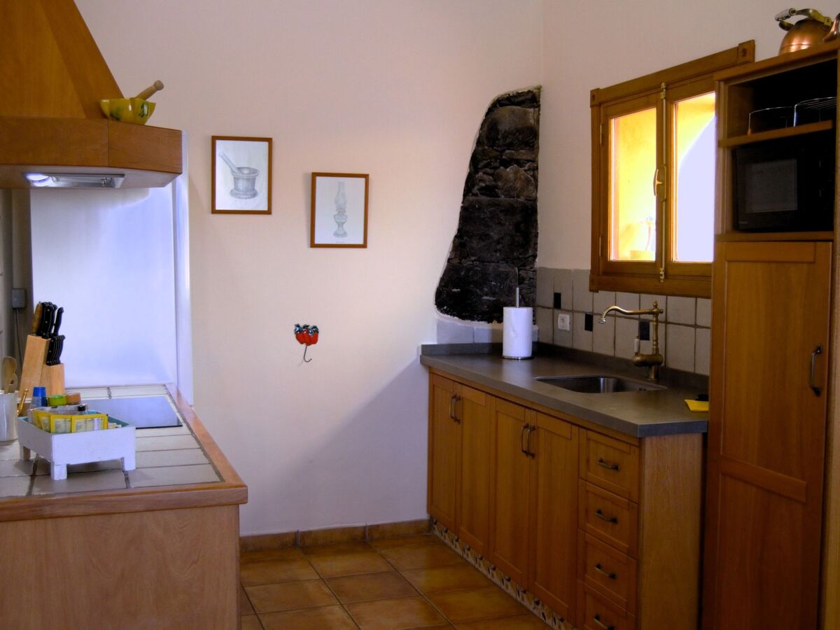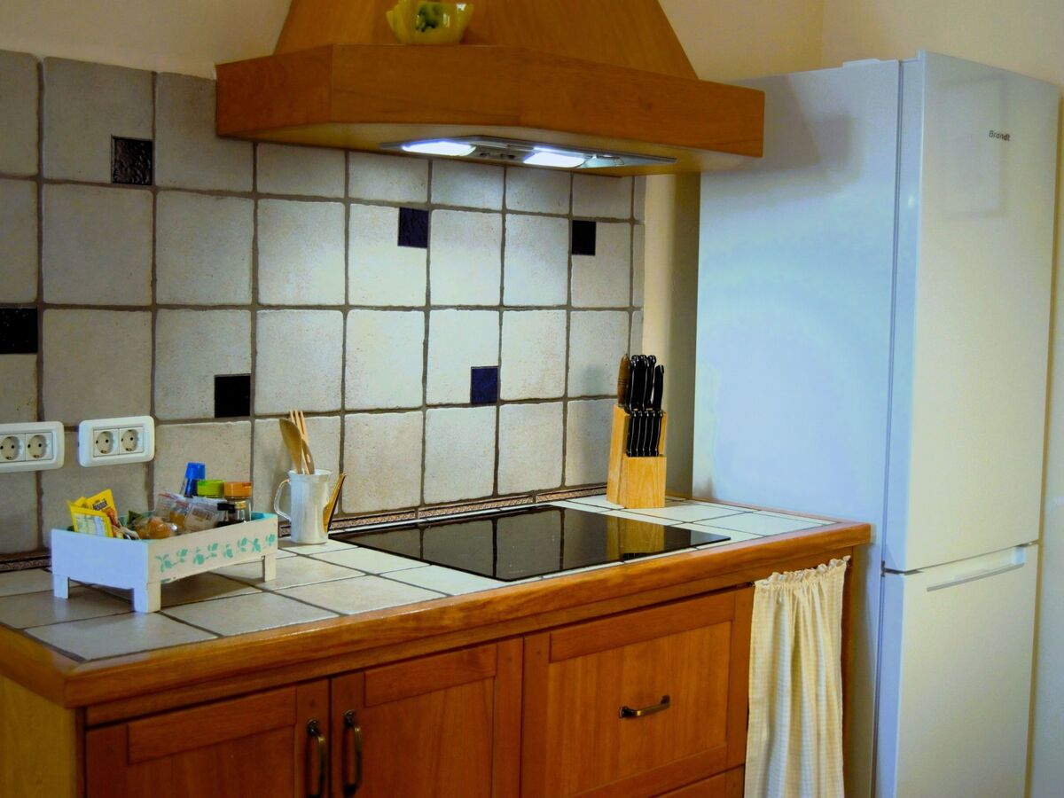 The kitchen, fully equipped with hob, microwave, coffee maker and fridge, awaits you to prepare delicious meals.