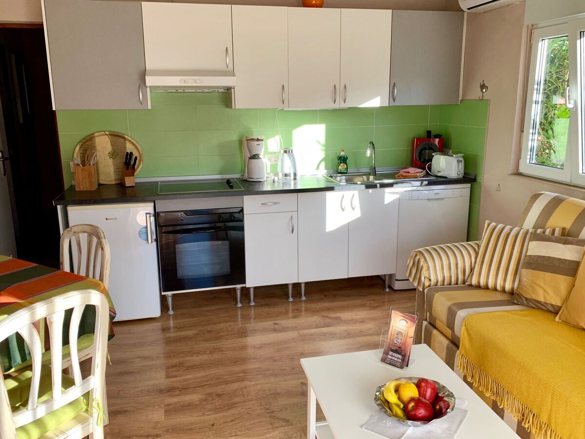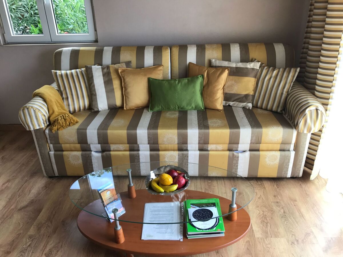 A bedroom with a large double bed (separate mattresses) for 2 people and an additional large sofa bed in the living room offers sleeping accommodation for a further 2 people.