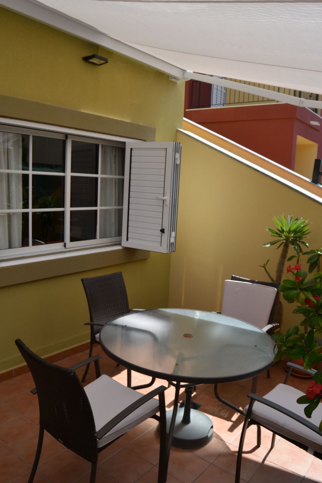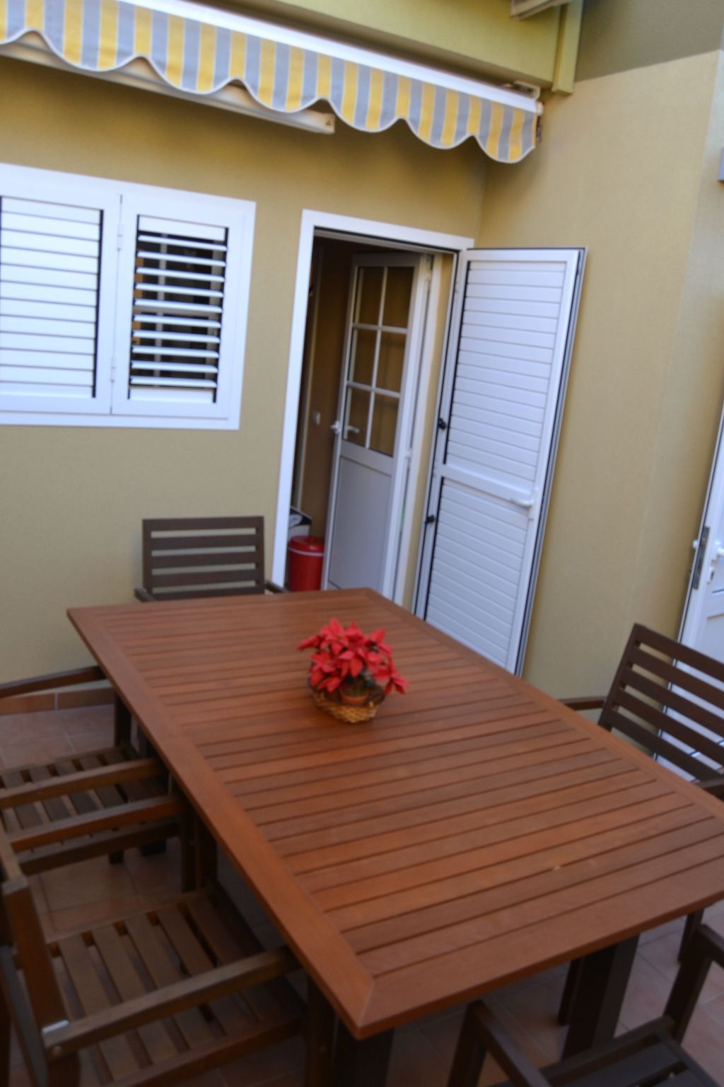 Equipped with two terraces, a balcony on the upper floor, private sunbeds, electric awning on the front terrace and manual awning on the back terrace, tables and chairs on the terraces.