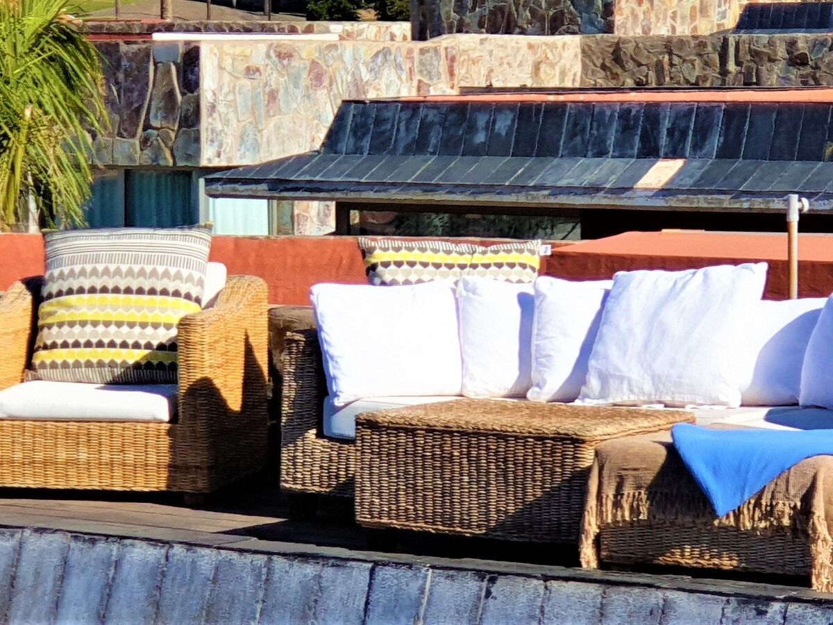 terrasse intérieure avec piscine - coin repas avec barbecue - salon de terrasse