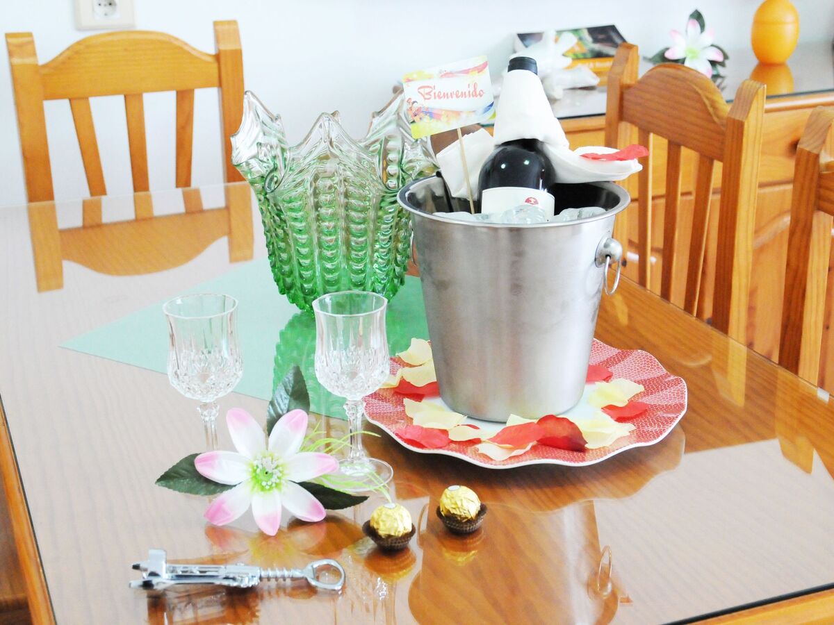 The living/dining room with the open plan kitchen is furnished with a sofa bed for two (135 cm), a flat screen satellite television and a dining table with chairs.