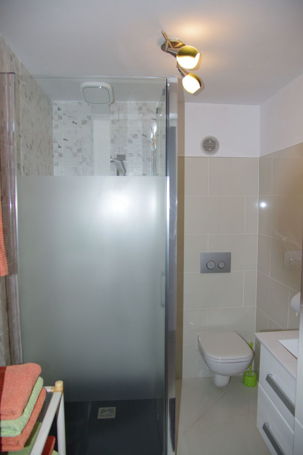 The smaller second bathroom has a semi-circular shower cubicle, a WC and an under-built wash hand basin.