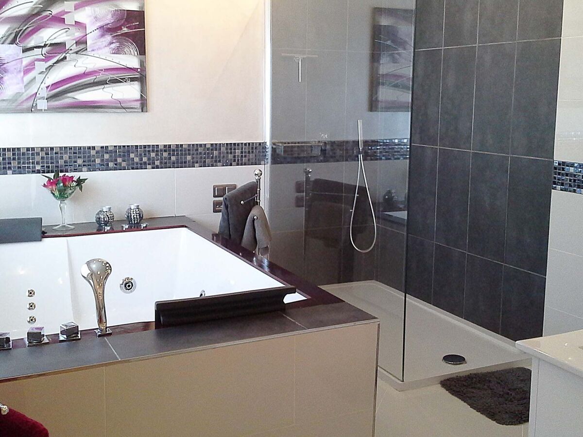 The large bathroom invites you to take a wellness bath in the whirlpool bathtub.