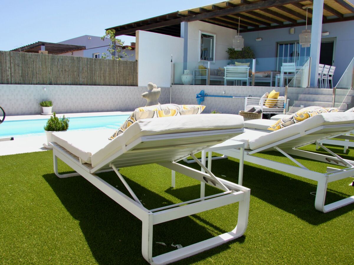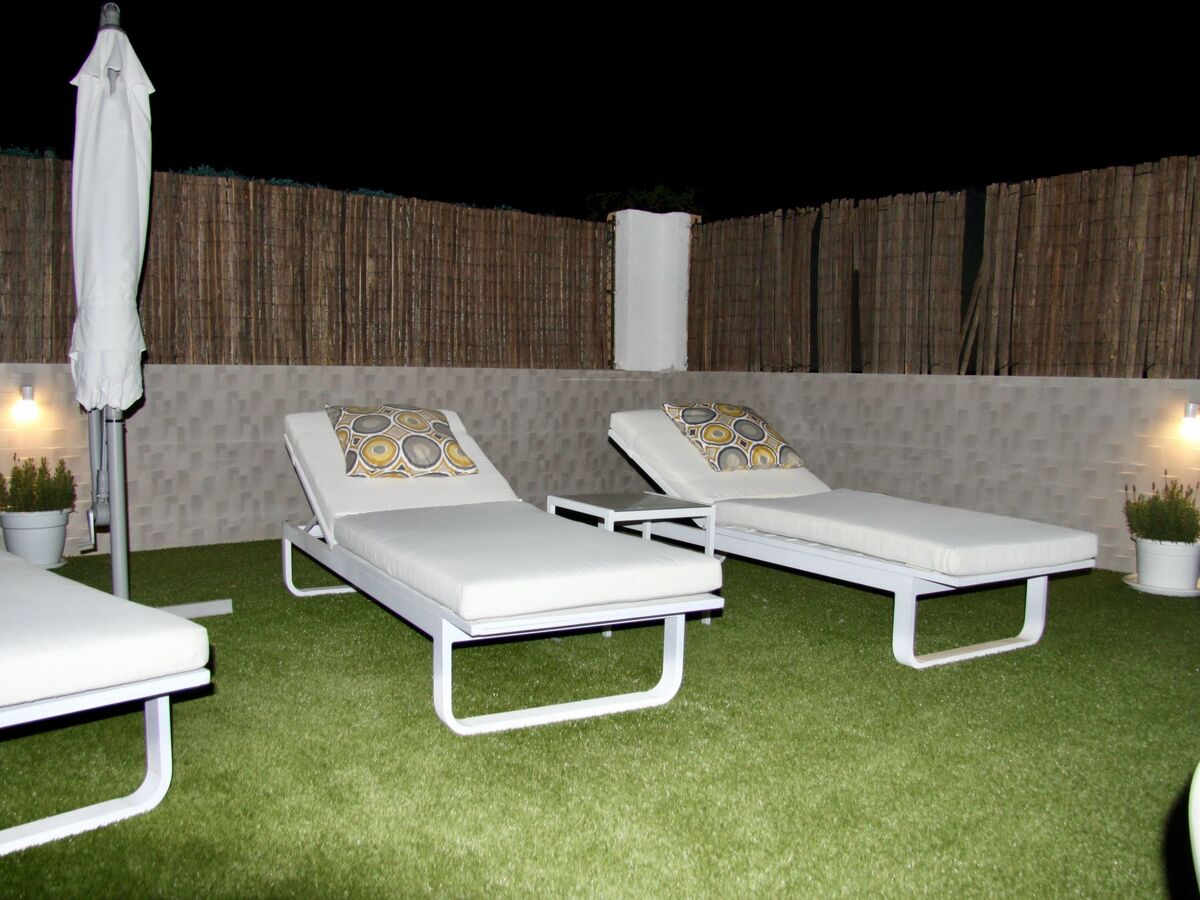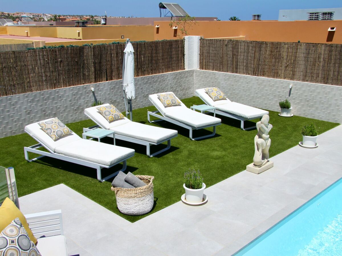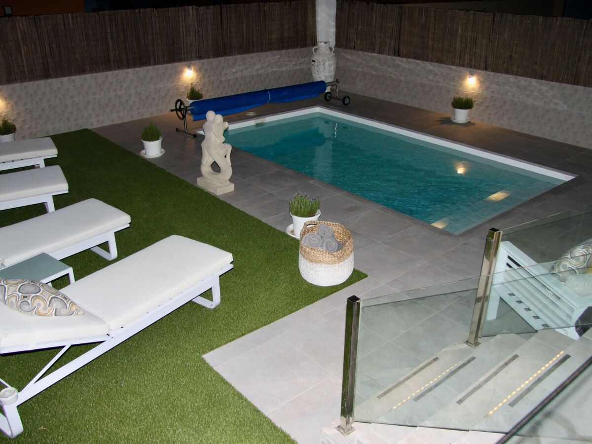 Le jardin inférieur comprend une piscine d'eau salée de 3m x 6m avec douche, la température de la piscine est maintenue à 28c -29c, de nombreux transats et des serviettes de plage sont fournis.