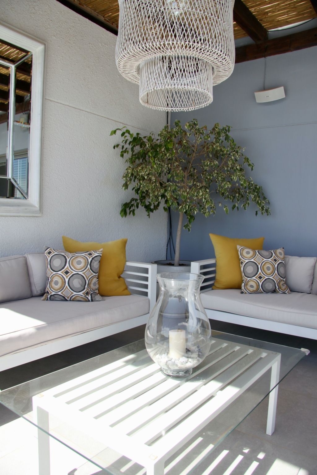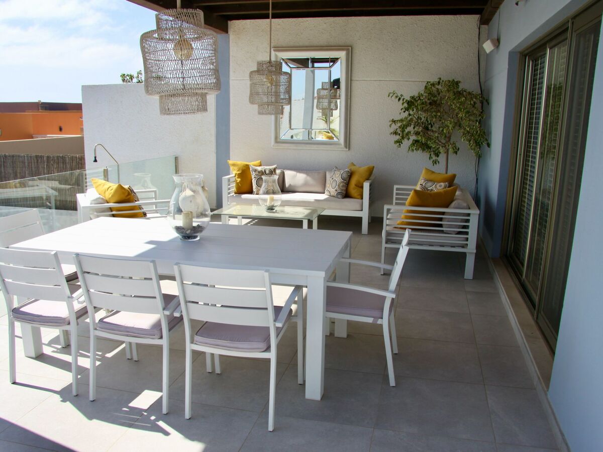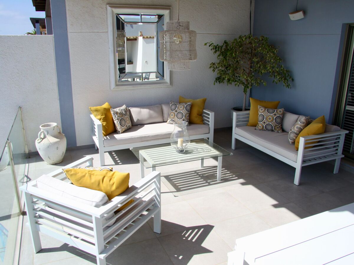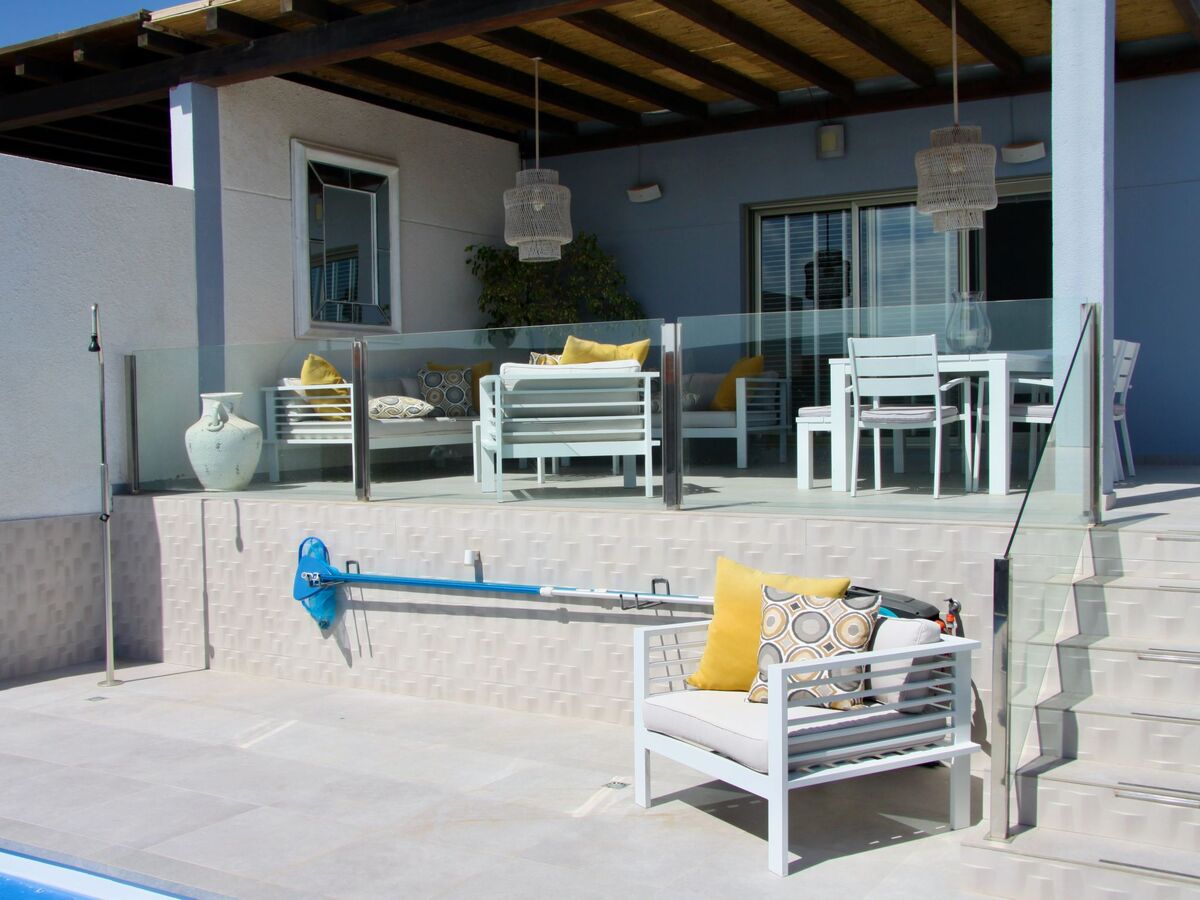 La villa dispose d'une terrasse supérieure spacieuse, qui comprend de nombreux sièges confortables et une table à manger pouvant accueillir jusqu'à 8 personnes.