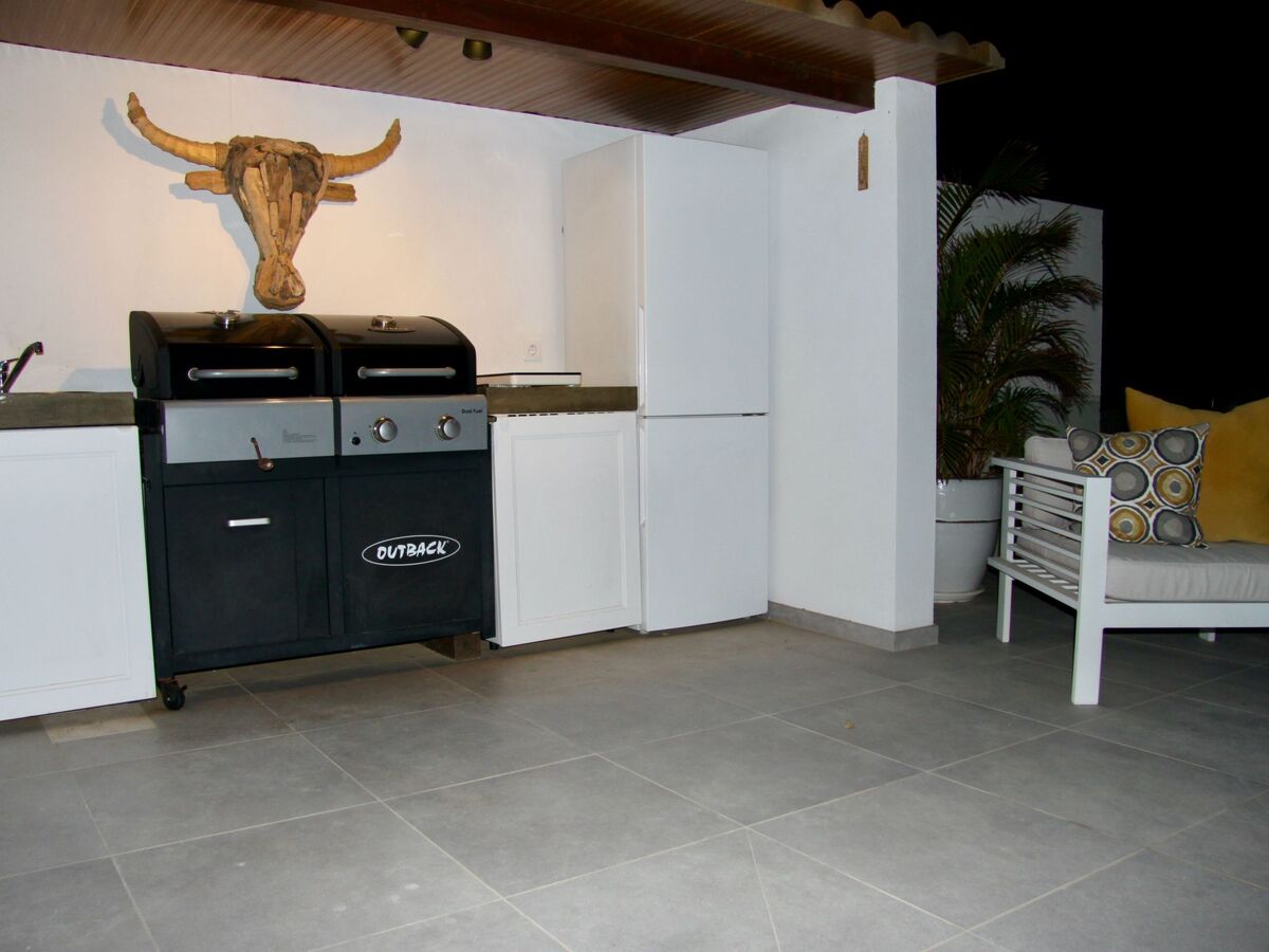 La cuisine extérieure comprend un barbecue, un évier et un réfrigérateur-congélateur, ainsi qu'une plaque chauffante à induction.
