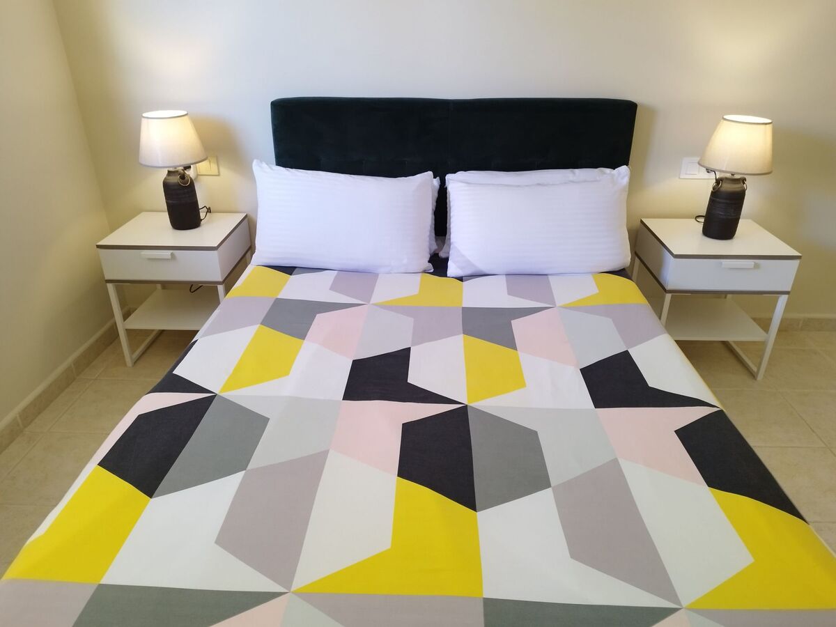 Chambre à coucher N° 1 ( au rez-de-chaussée ) : 1 grand lit double 135 x 190 cm avec 2 chevets – Armoire penderie – Coffre fort – Ventilateur – Lit bébé pliable et matelas bébé.