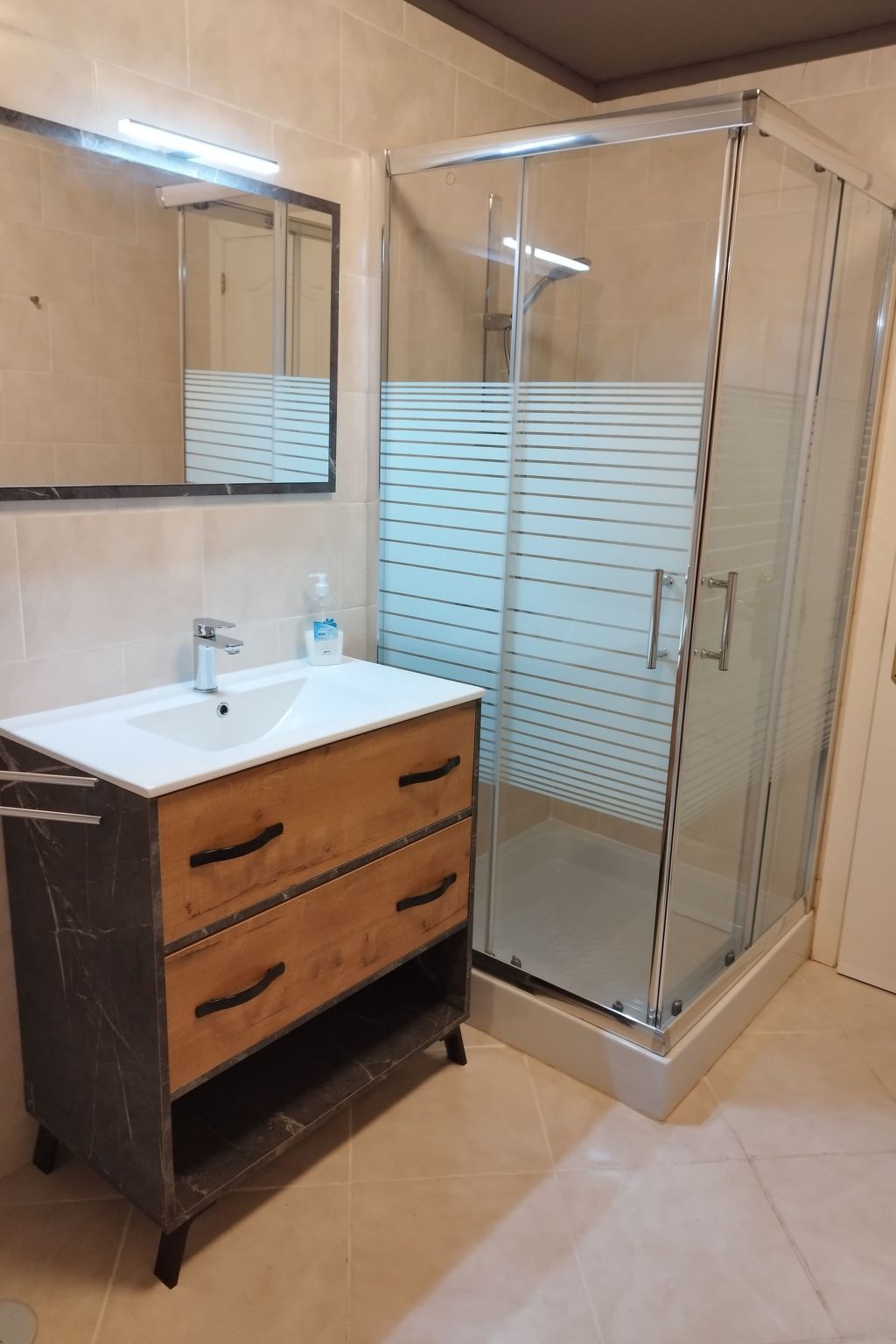 Salle de douche et W.C ( au rez-de-chaussée ) : Douche cabine – Meuble vasque – Miroir – Meuble de rangement.