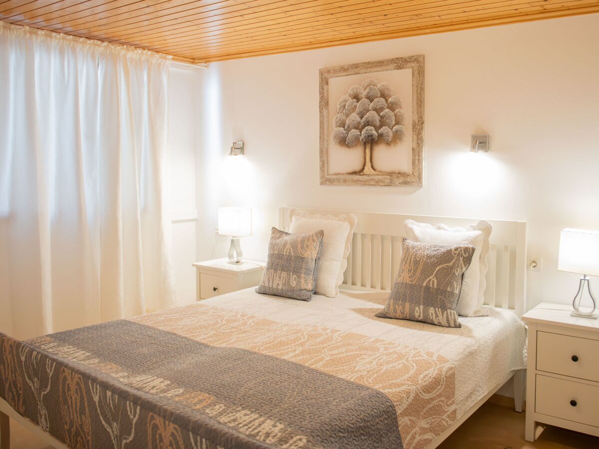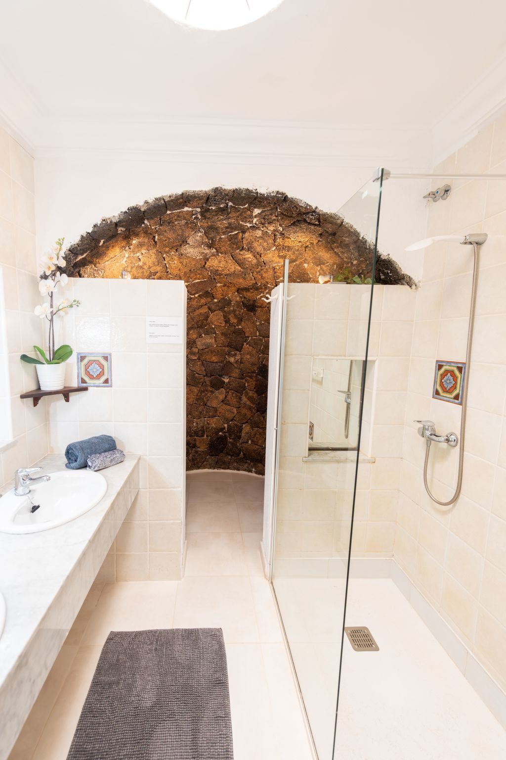 The first bedroom with a double bed leads to an adjoining bathroom with a bathtub, while the third bedroom with a 1.40 metre wide mattress and a bathroom are set directly in a grotto.