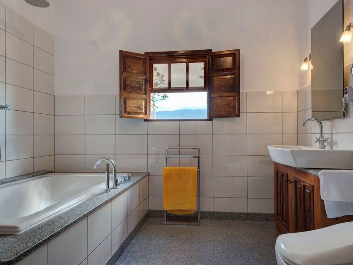 The main bathroom consists of a large bathtub, a toilet, a sink and a nice view of the Caldera.
