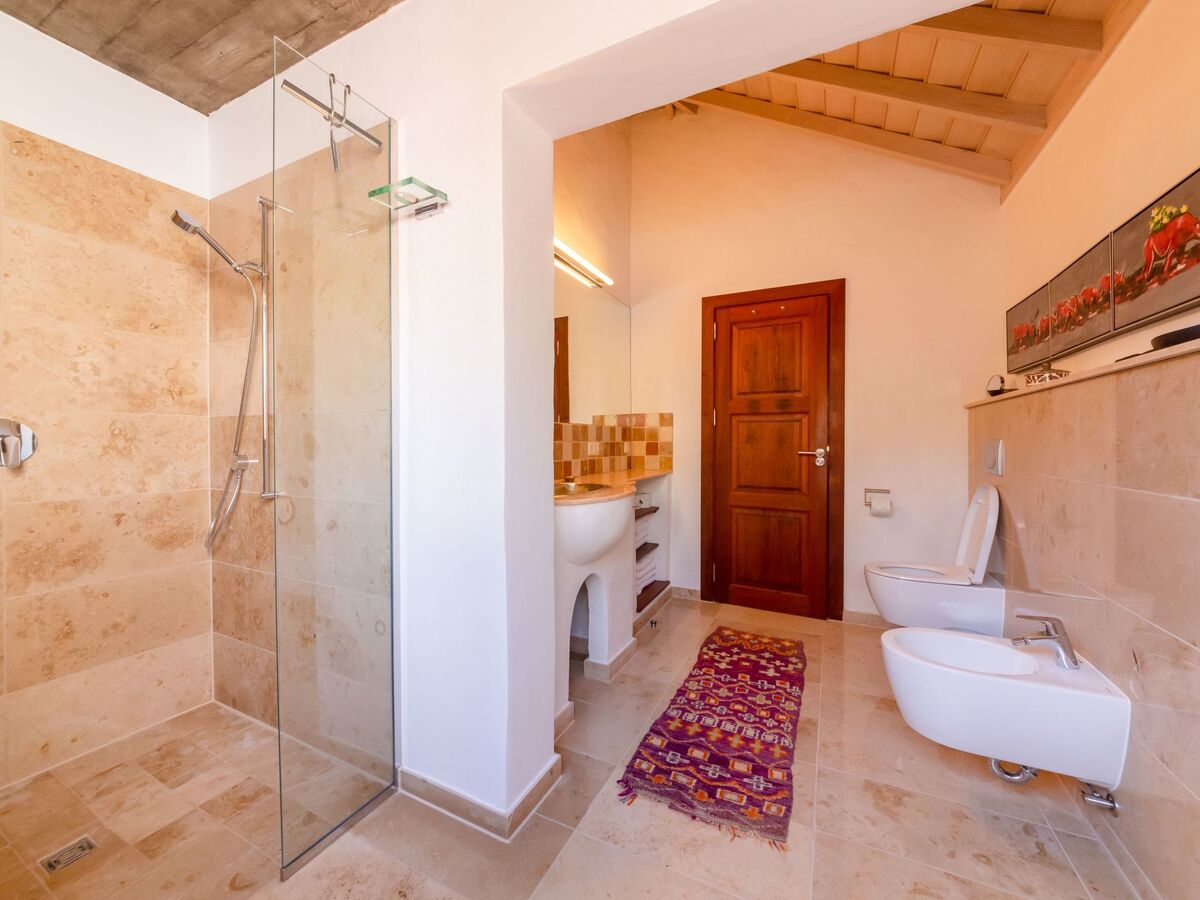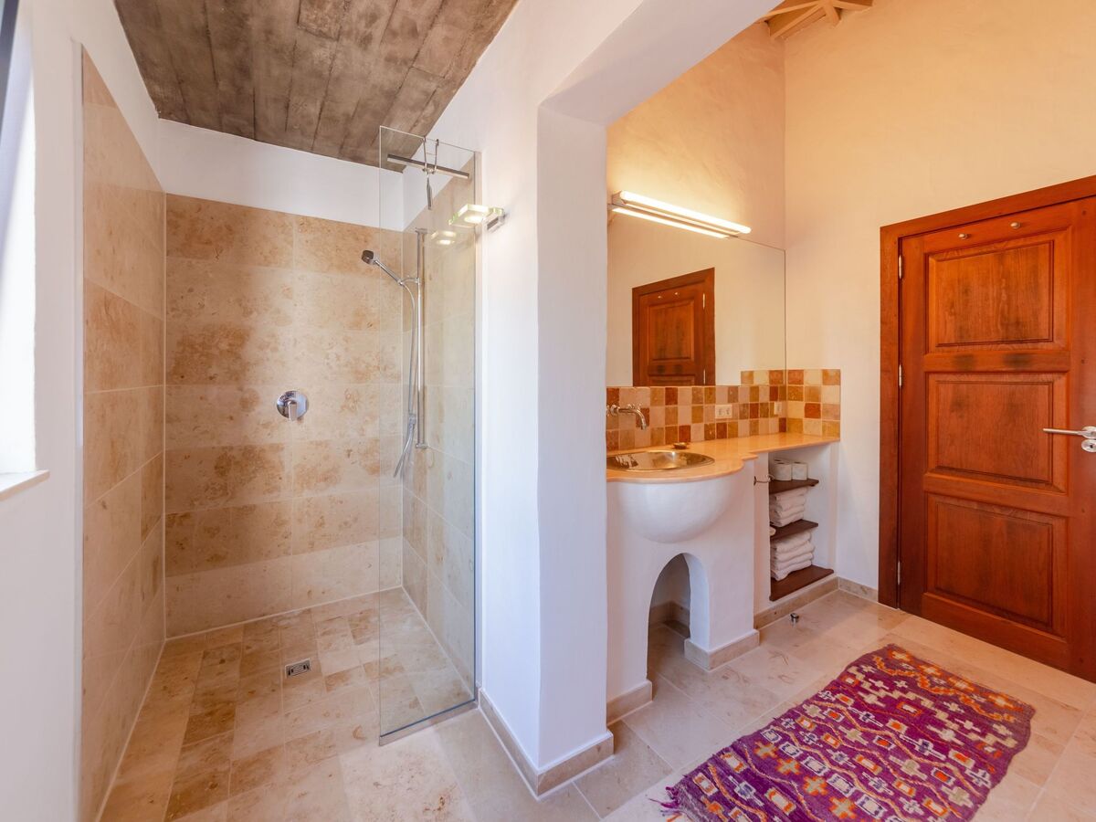 The bathroom is tiled with antique travertine marble; the beautiful Moroccan handcrafted metal washbasin gives the bathroom a clear oriental inspiration.