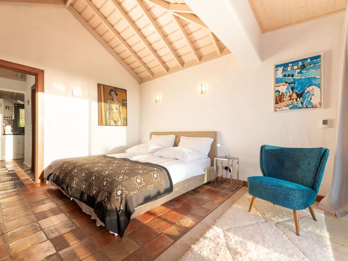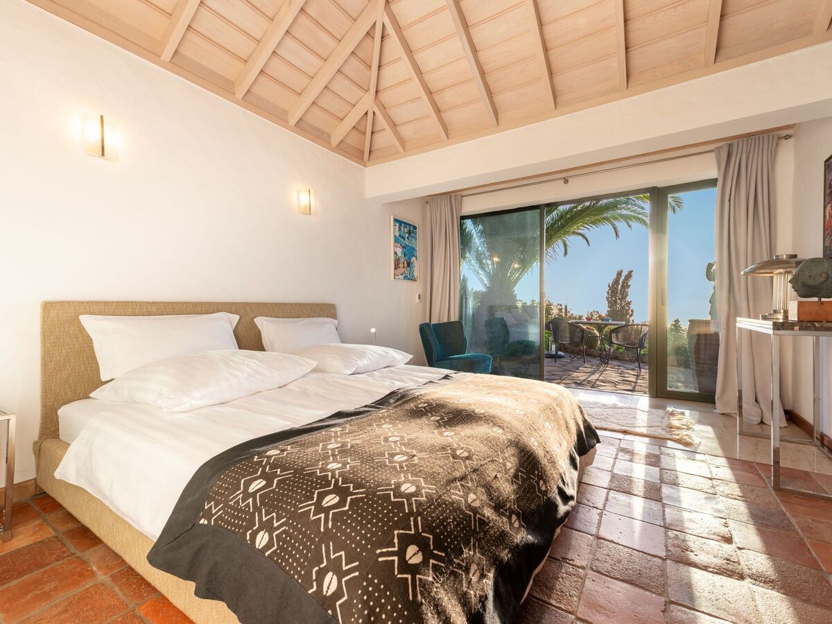 The bedroom with a French bed has a large double door directly onto the terrace.