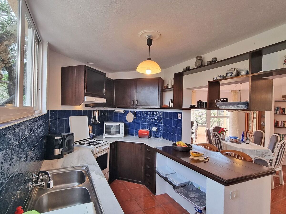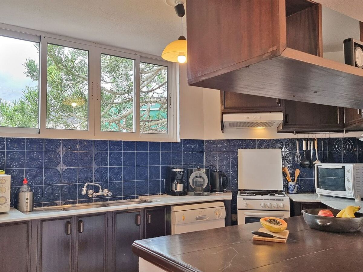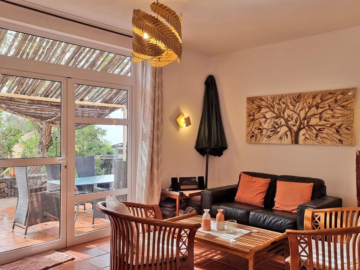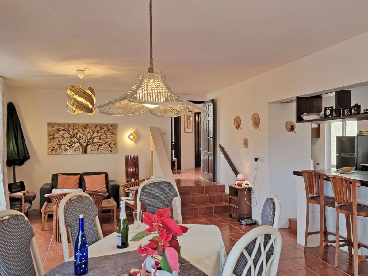 The bungalow with its extraordinary architecture is divided into three levels, entrance area with guest toilet, 3 steps to the living area with dining area, kitchen separated with a bar to the living area and fireplace room with German satellite TV or Smart TV.