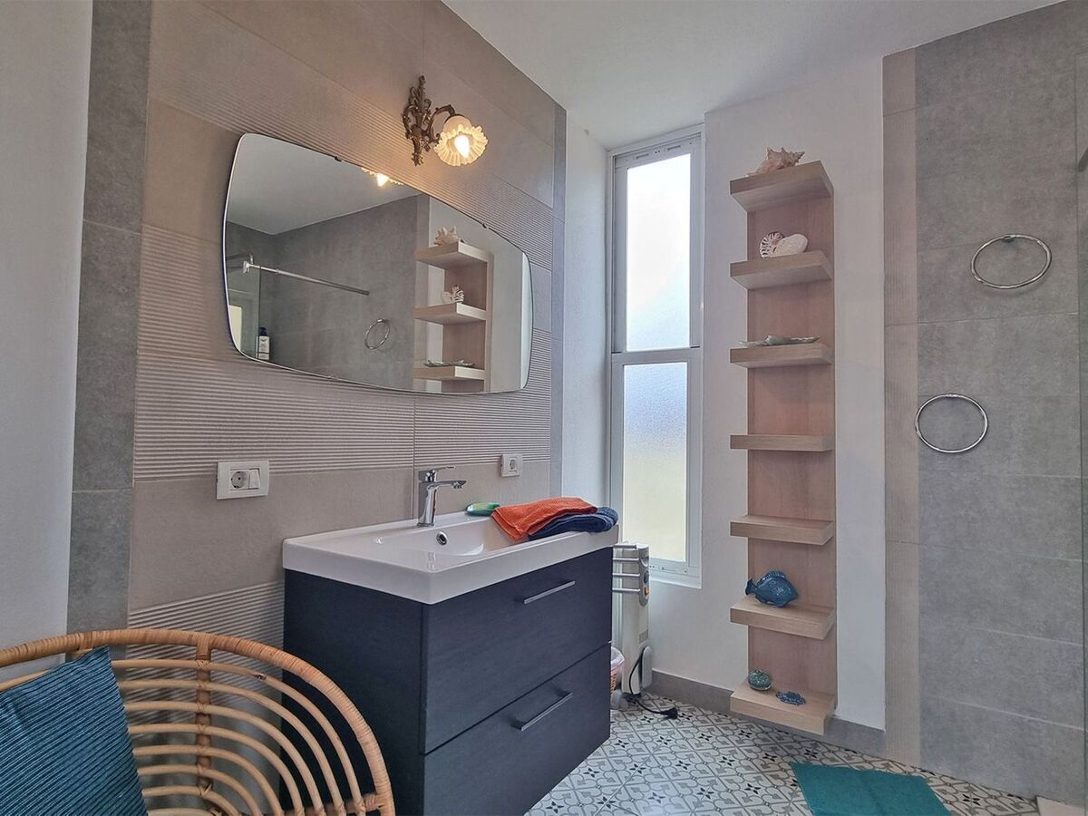 In the upper area, separated by a connecting door, are the two bedrooms and the bathroom.