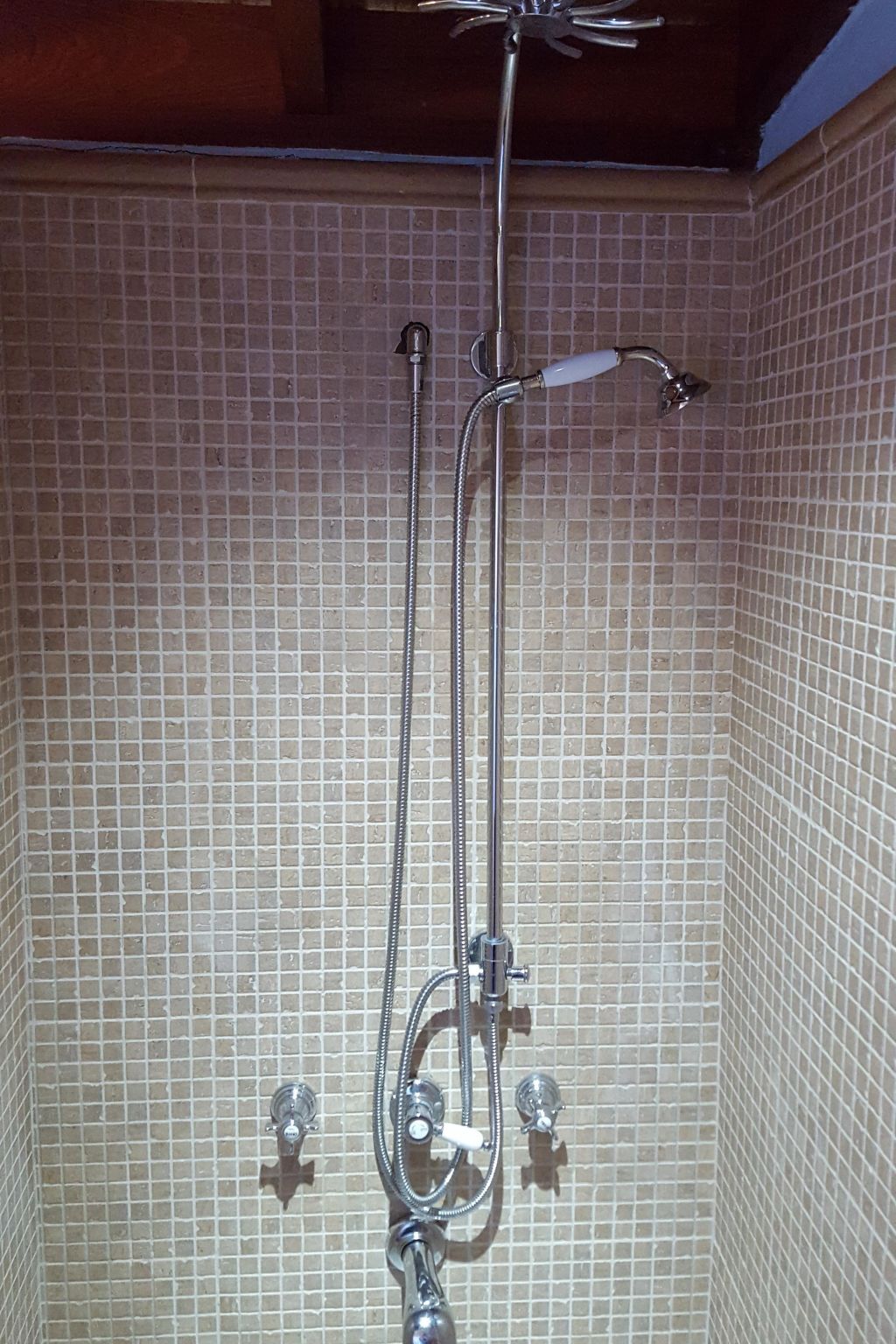 Large bathroom with shower, hairdryer and hair dryer, shampoo, body gel, first aid kit, hygiene products for women, etc.