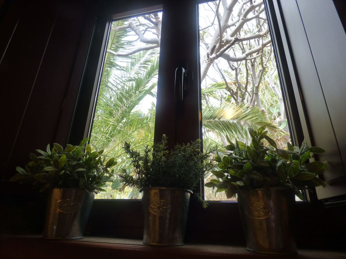 In the porch we have an extendable table of glass and aluminium with 4 chairs, ideal to enjoy lunches and dinners outside, we also have a comfortable sofa-bin and auxiliary table, ideal to rest, read, contemplate the landscape with its mountains and palm grove.