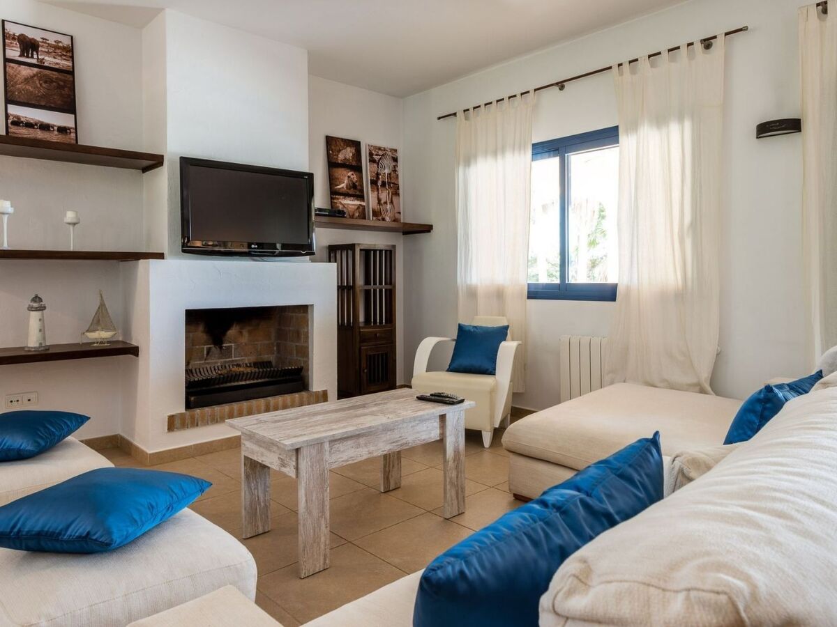 The living room is spacious and comfortable, with white sofas that contrast nicely with the large blue windows, typical of the area, and a natural wood table that adds a touch of class to the ambience.