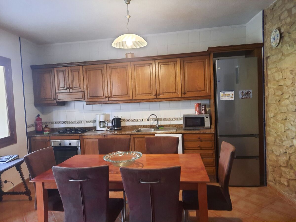 The spacious kitchen is equipped with a large dining table for shared meals and a fireplace, as well as a gas cooker, an oven, a refrigerator with freezer, a coffee machine and a microwave.