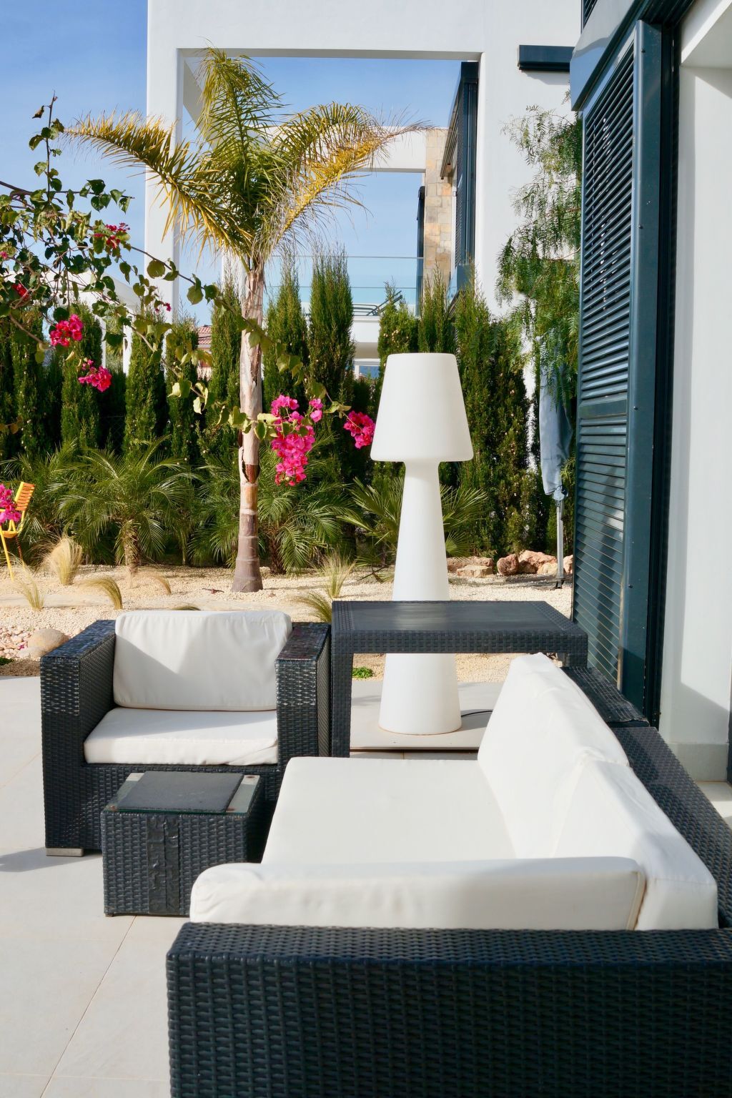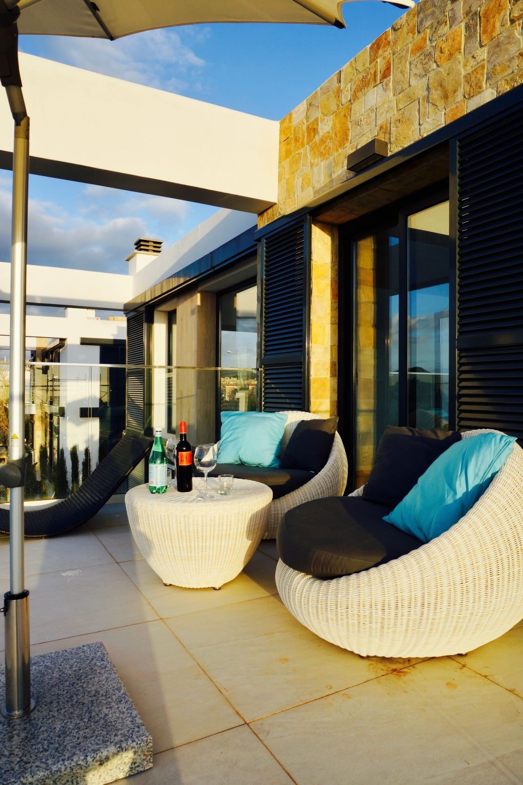 A spacious rattan settee with parasol invites you to linger.