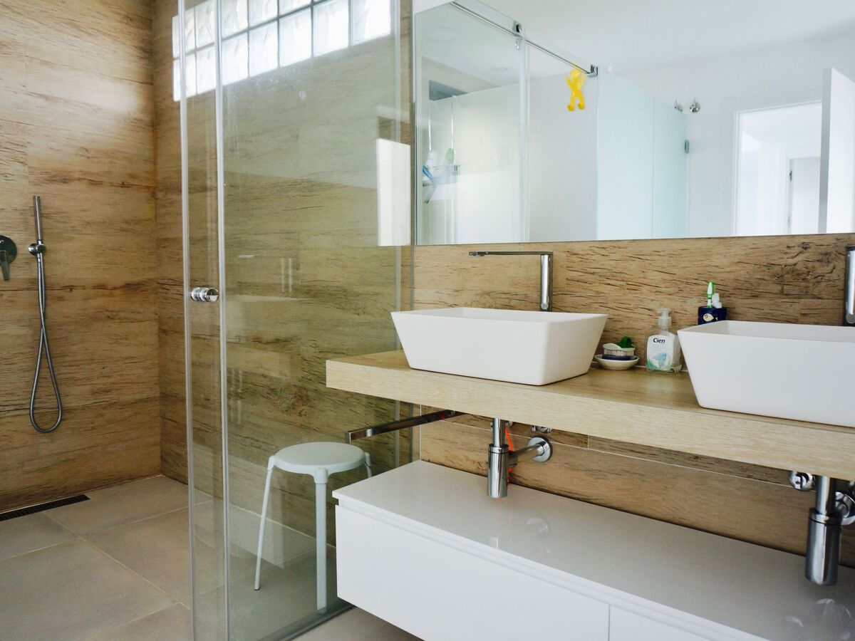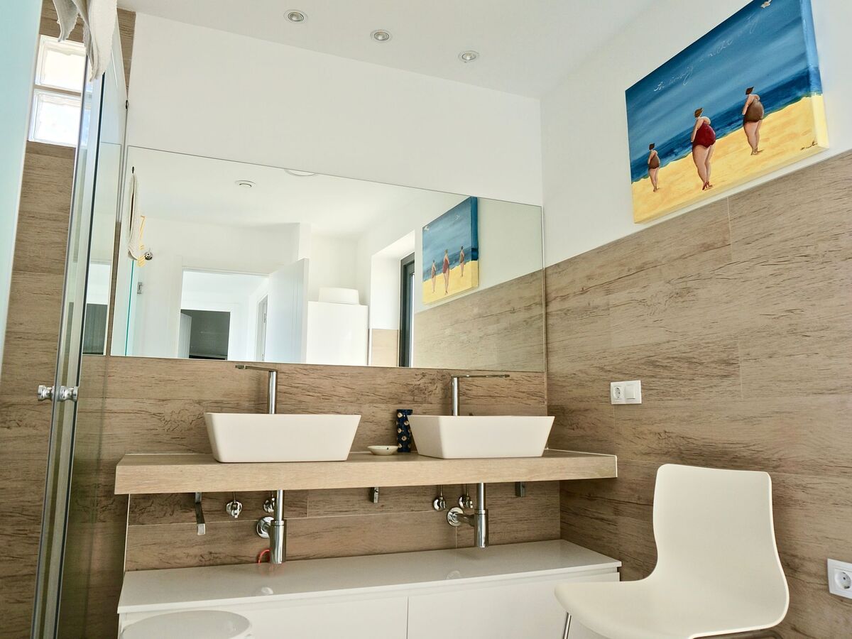 A second large bathroom with underfloor heating, spacious shower, WC, double washbasin and glass door to a large outdoor shower complete the offer.