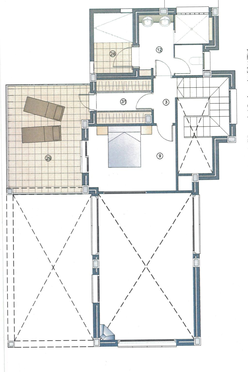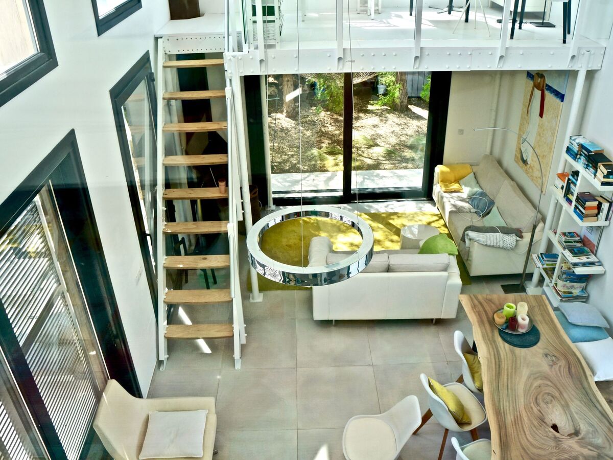 A staircase leads to the upper floor, where there is another bedroom (bed 160x200cm) with access to the large balcony.