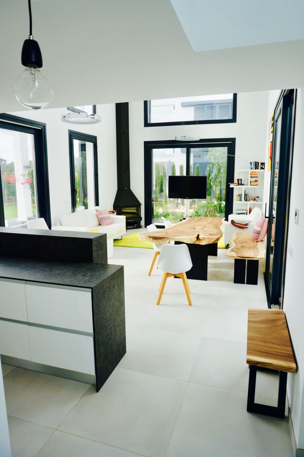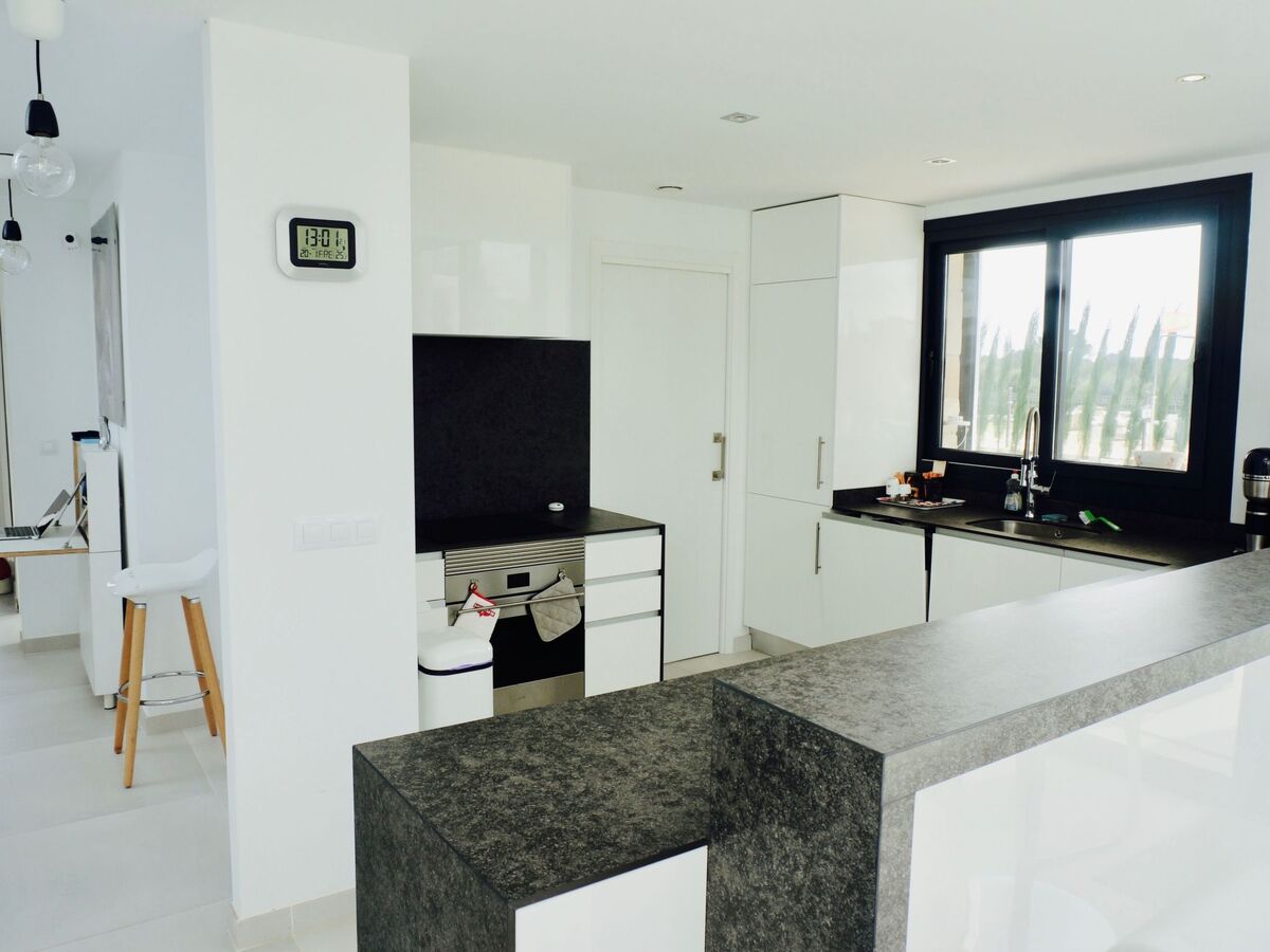 From the living area you enter the open, modern kitchen, which is visually separated from the living area by a counter.