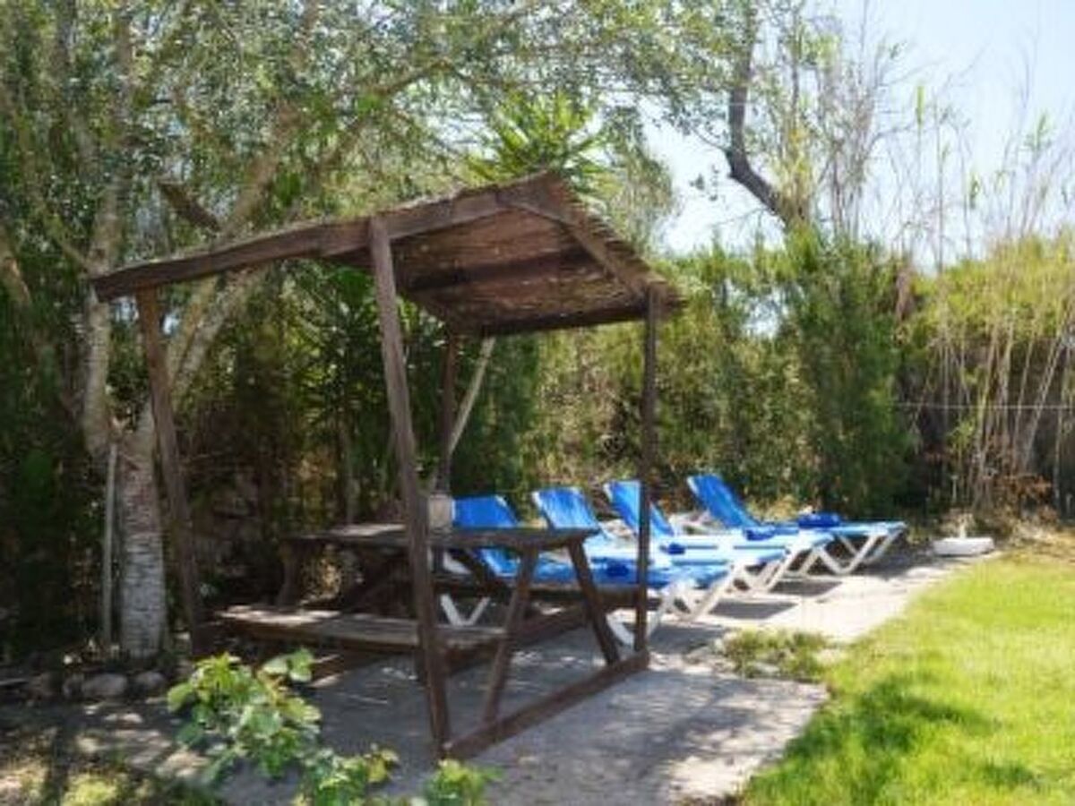 Outside terrace with dining area, garden and pool area, barbecue area.